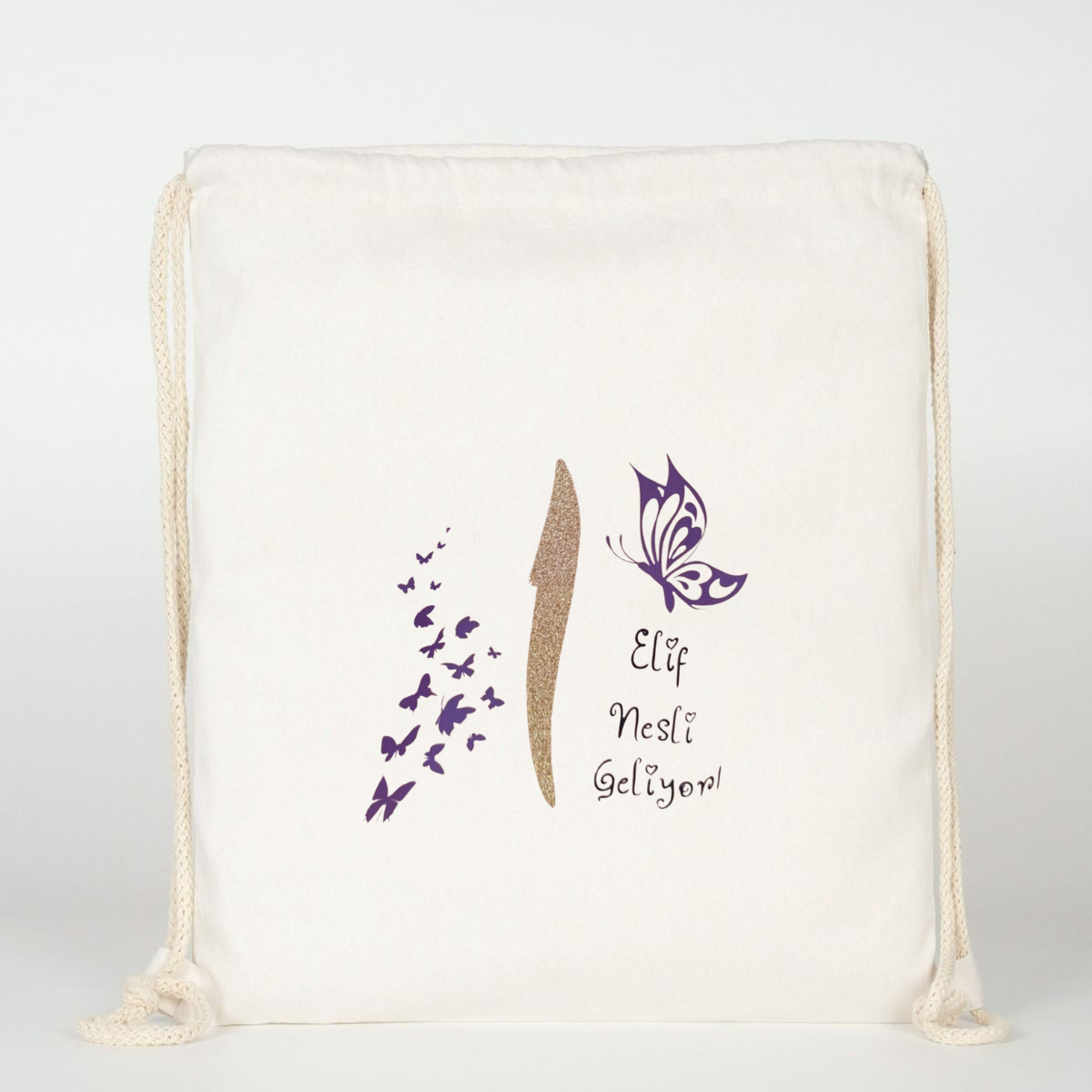 "Elif Nesli Geliyor "Lila Baskılı Ham Bez Sırt Çantası %100 Pamuk