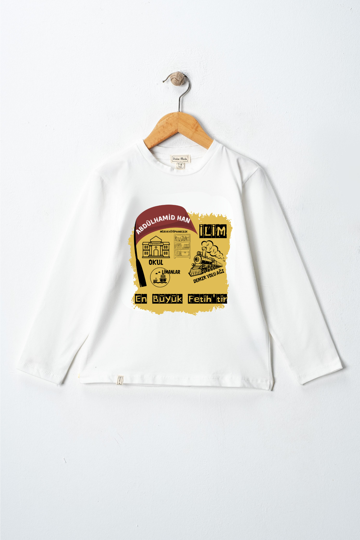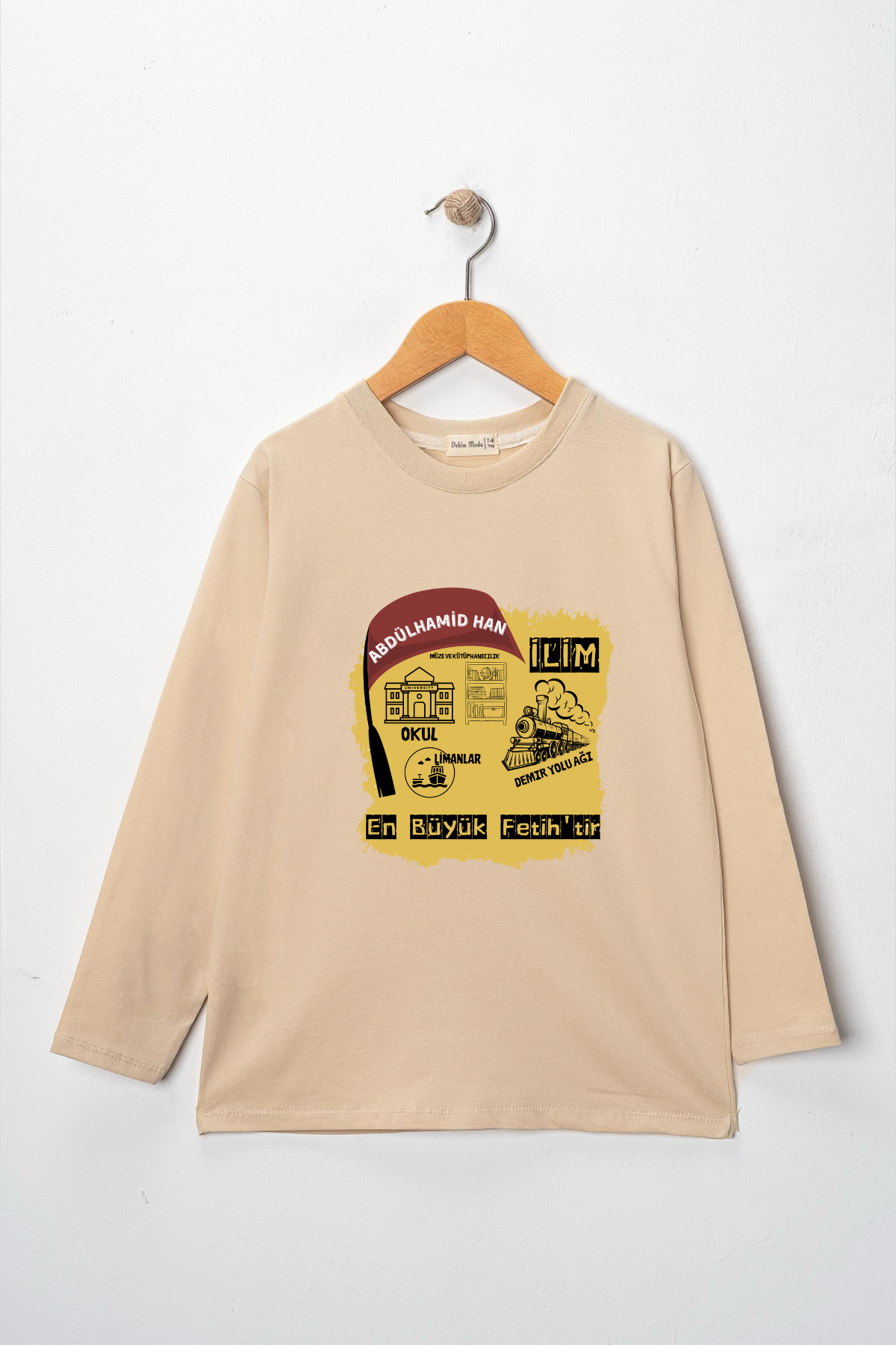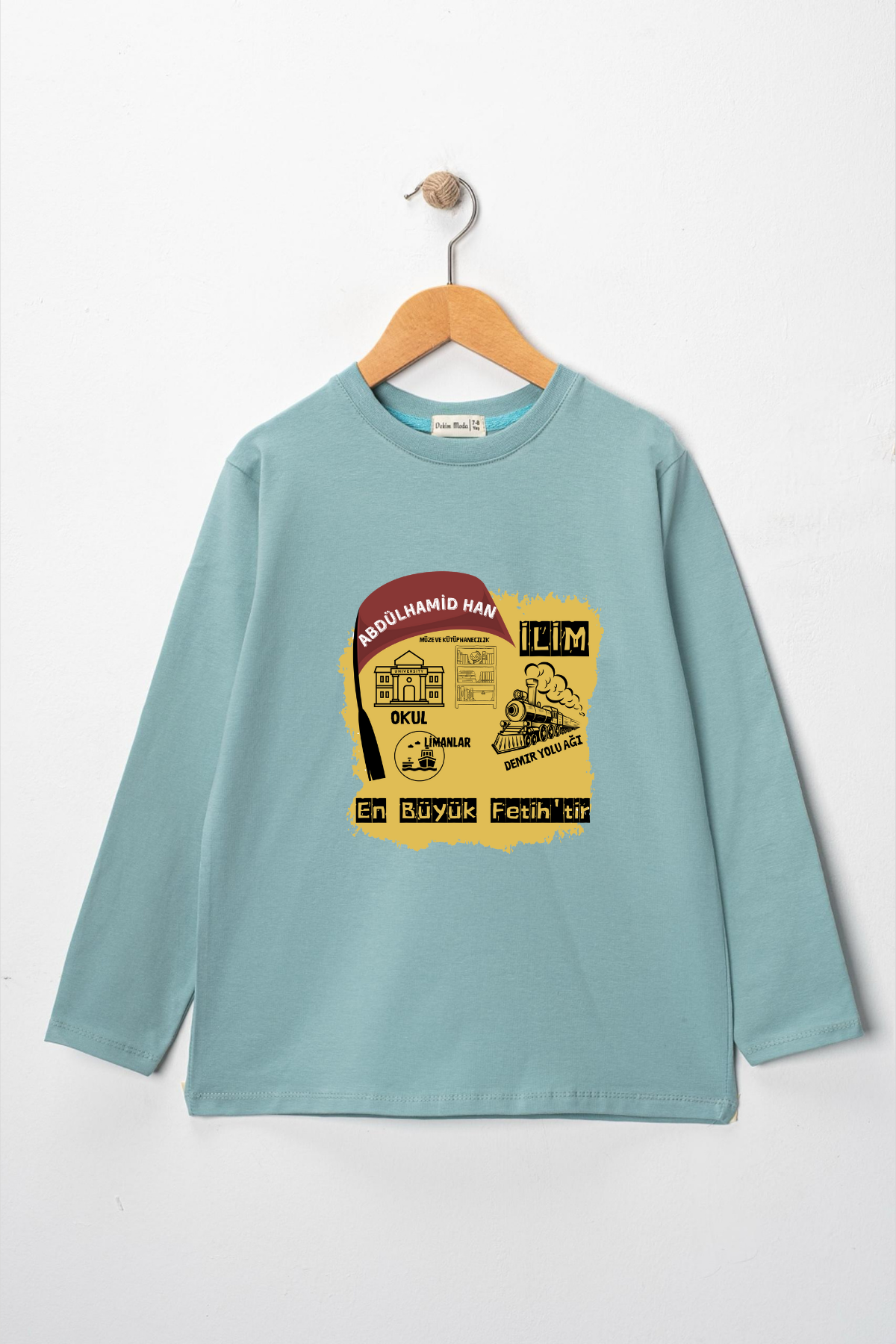 Uzun kollu, pamuklu, bisiklet yaka, "Abdülhamid Han" baskılı özel tasarım üründür. Çocuk fıtratına uygun, çocukların sevebileceği görseller kullanılarak tasarlanmıştır.