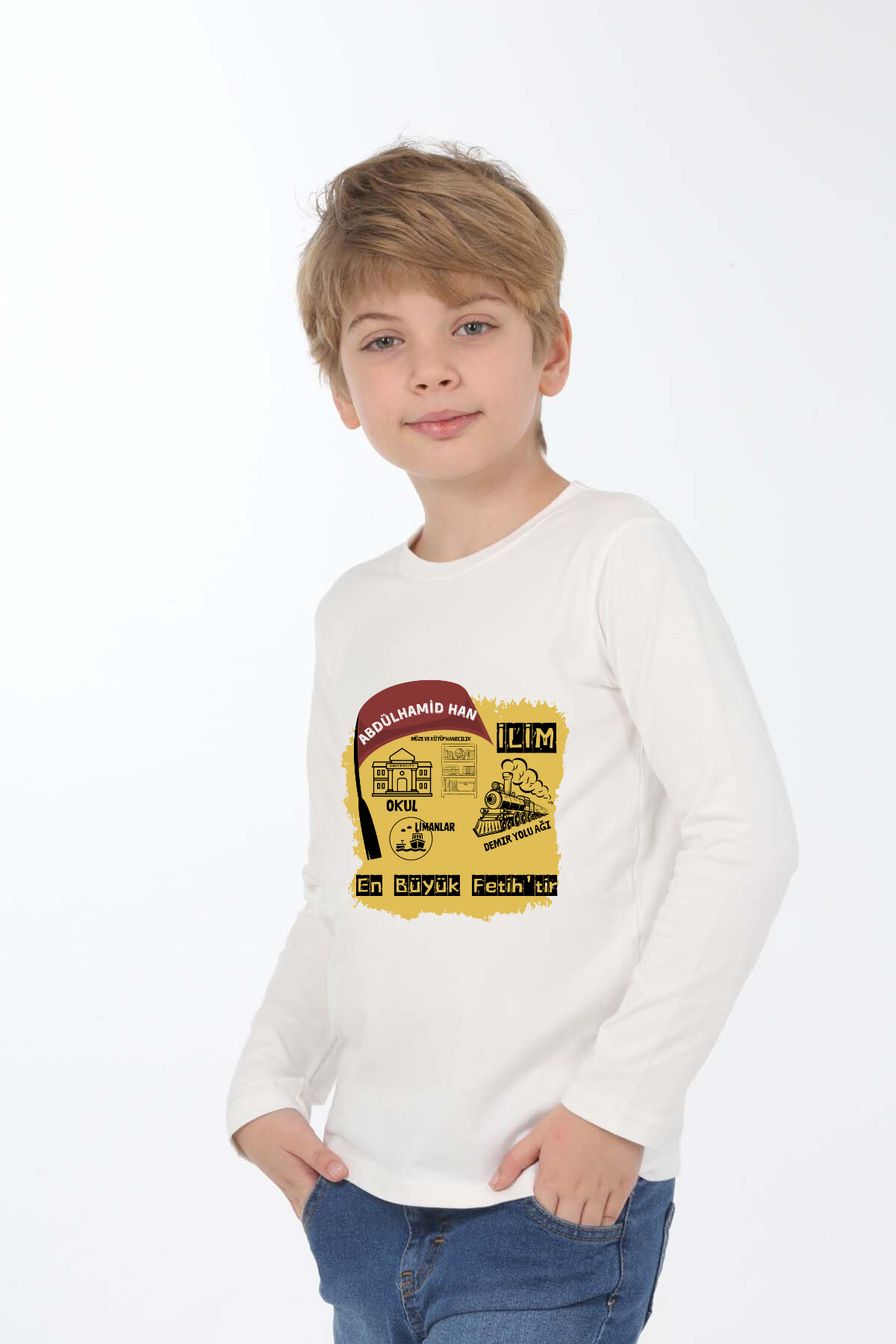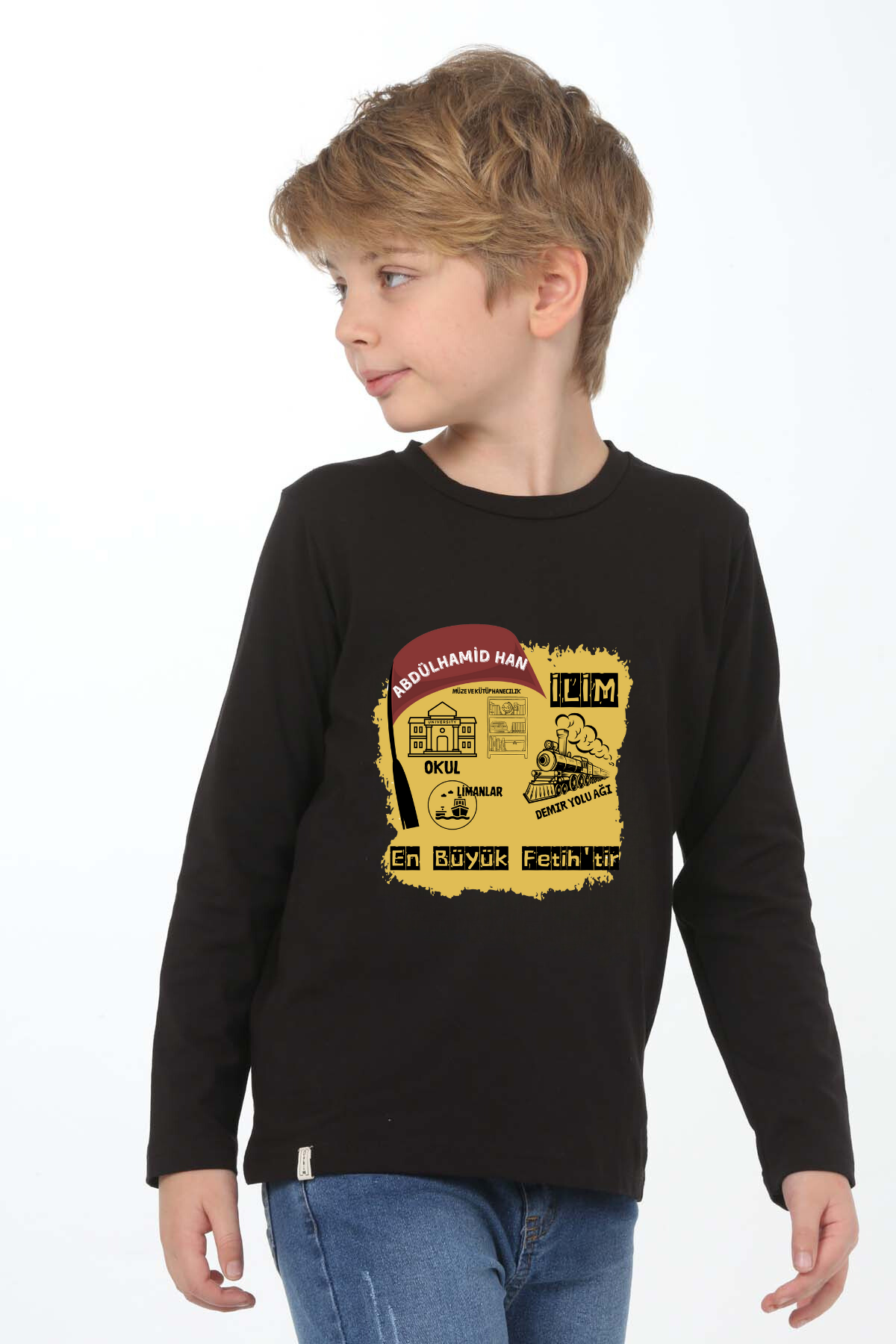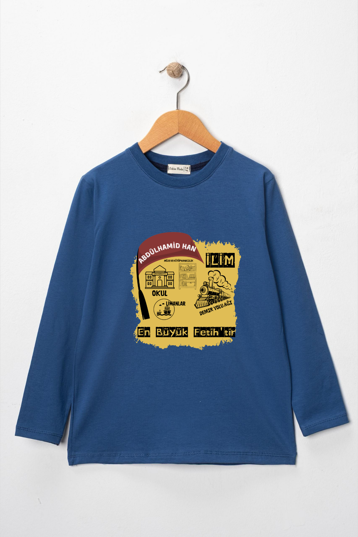 Uzun kollu, pamuklu, bisiklet yaka, "Abdülhamid Han" baskılı özel tasarım üründür. Çocuk fıtratına uygun, çocukların sevebileceği görseller kullanılarak tasarlanmıştır.