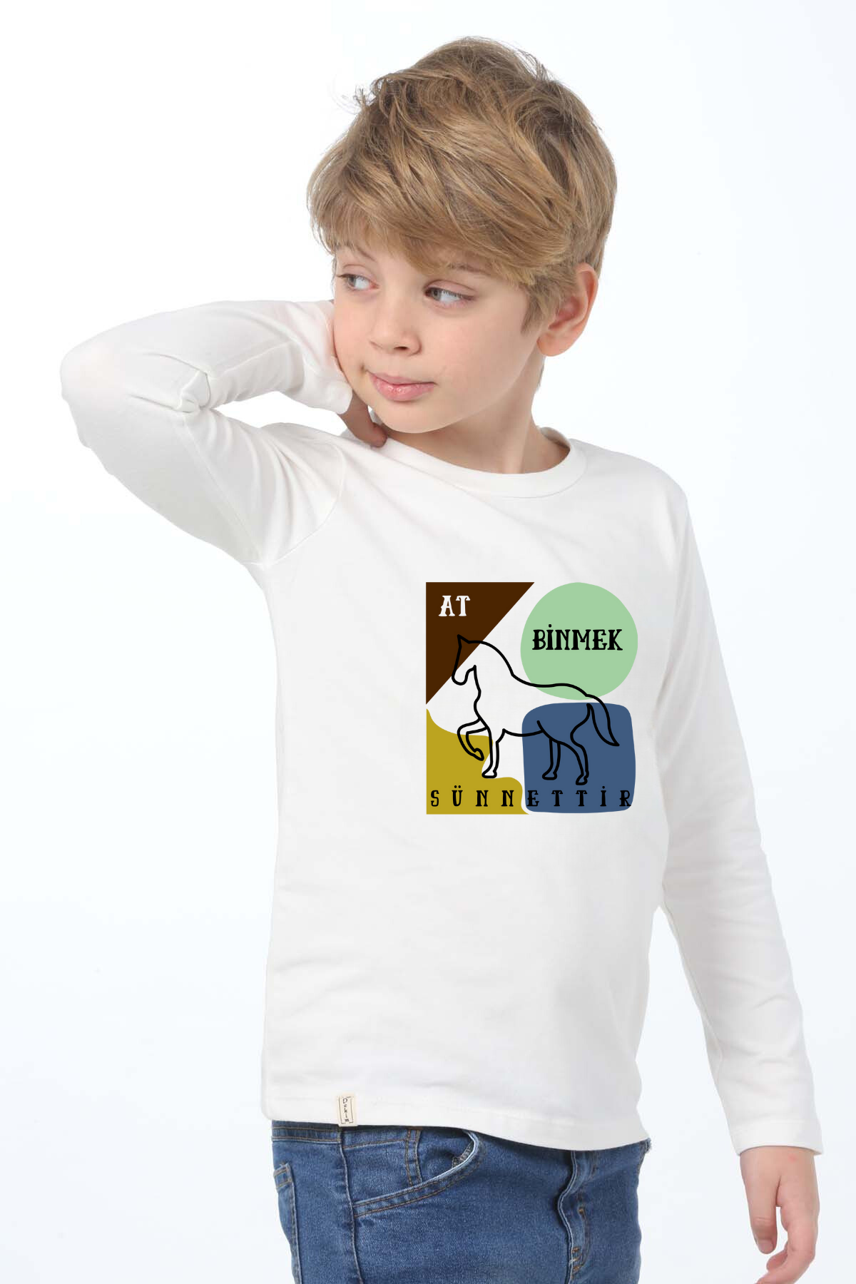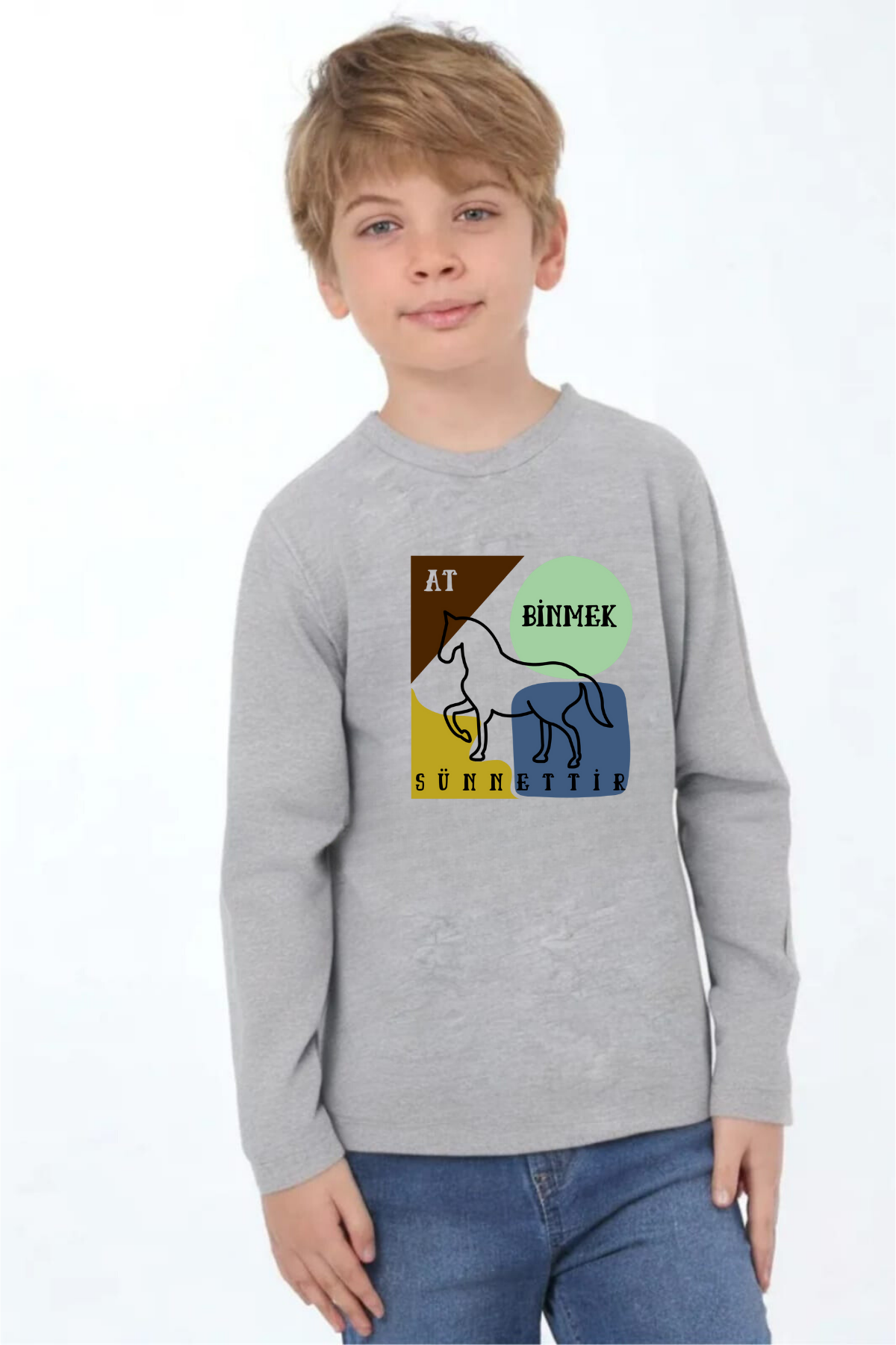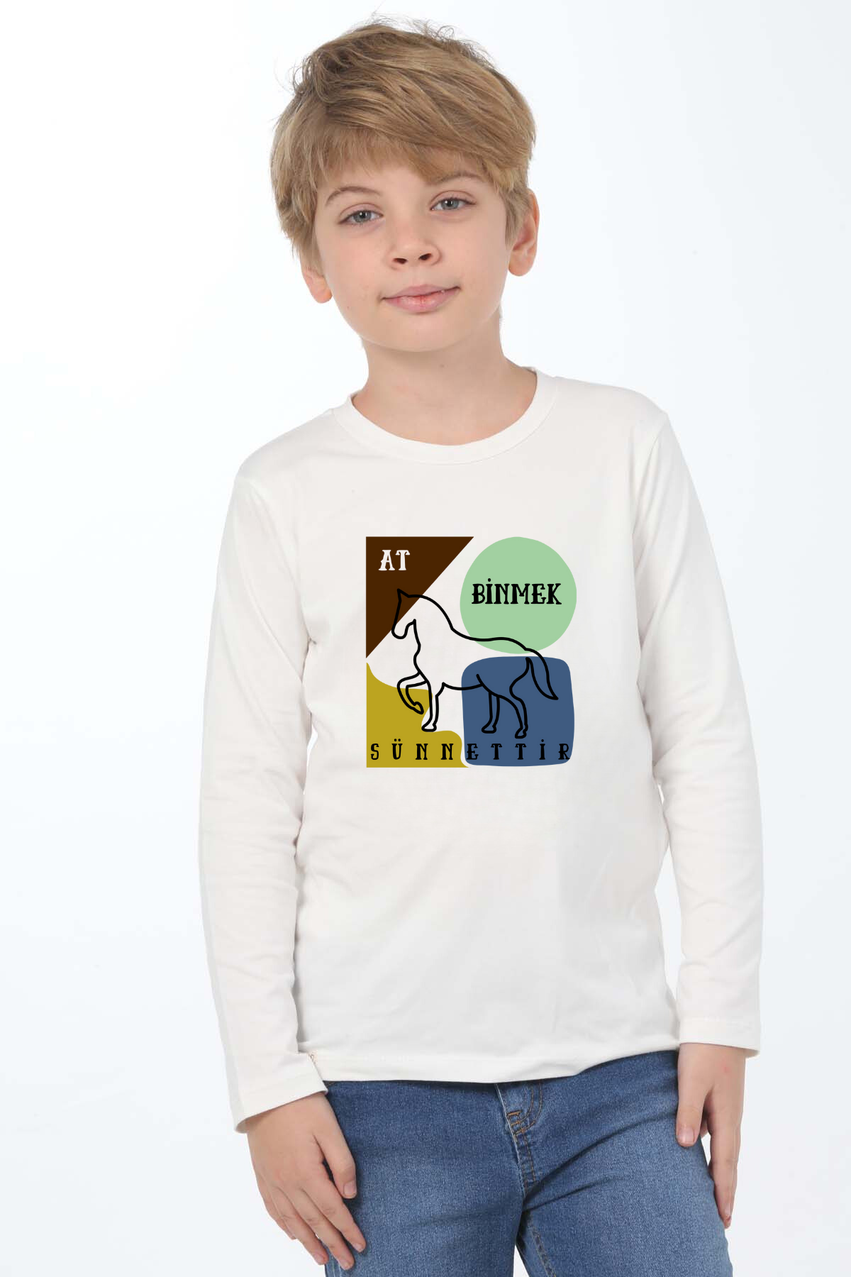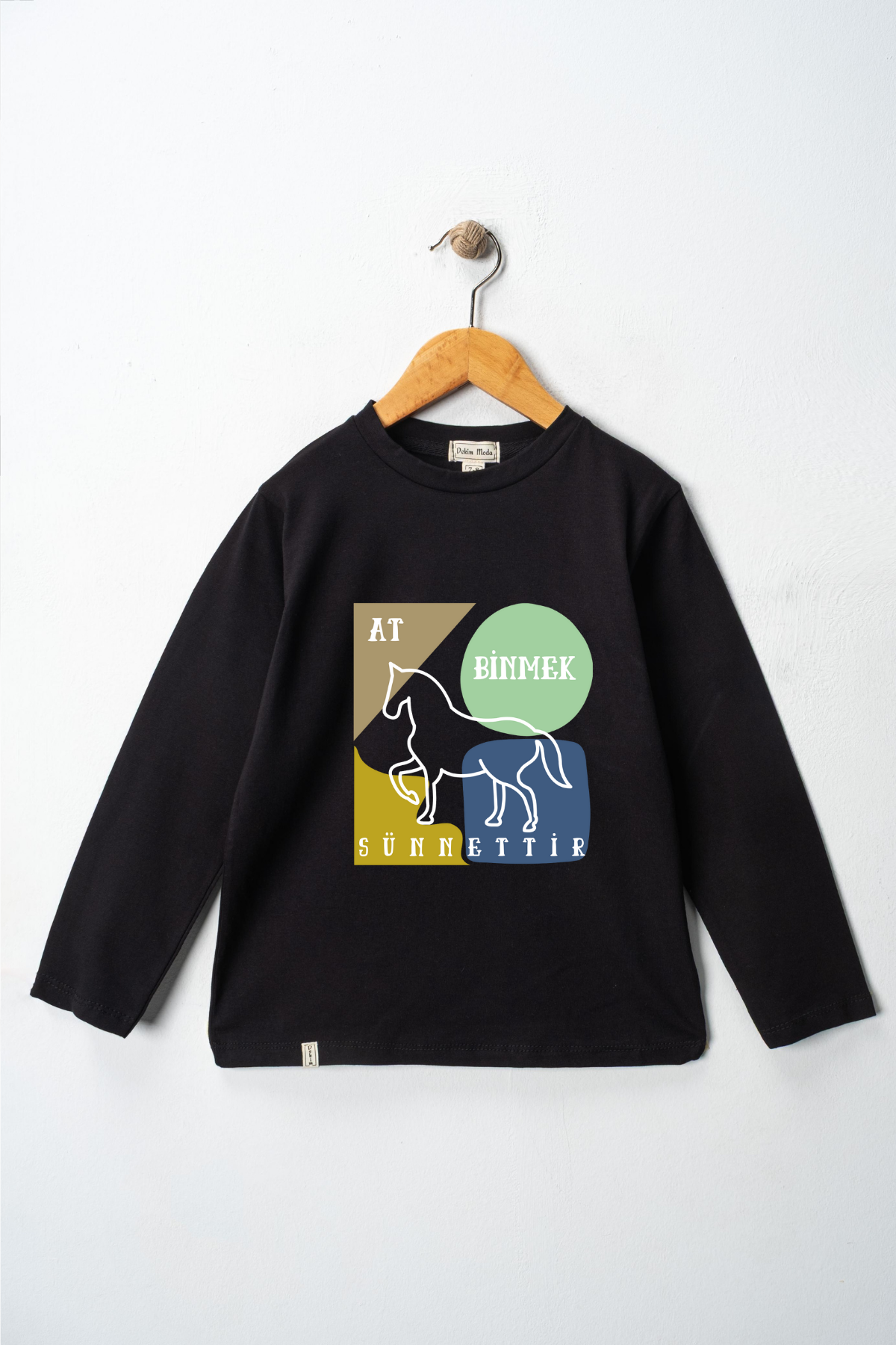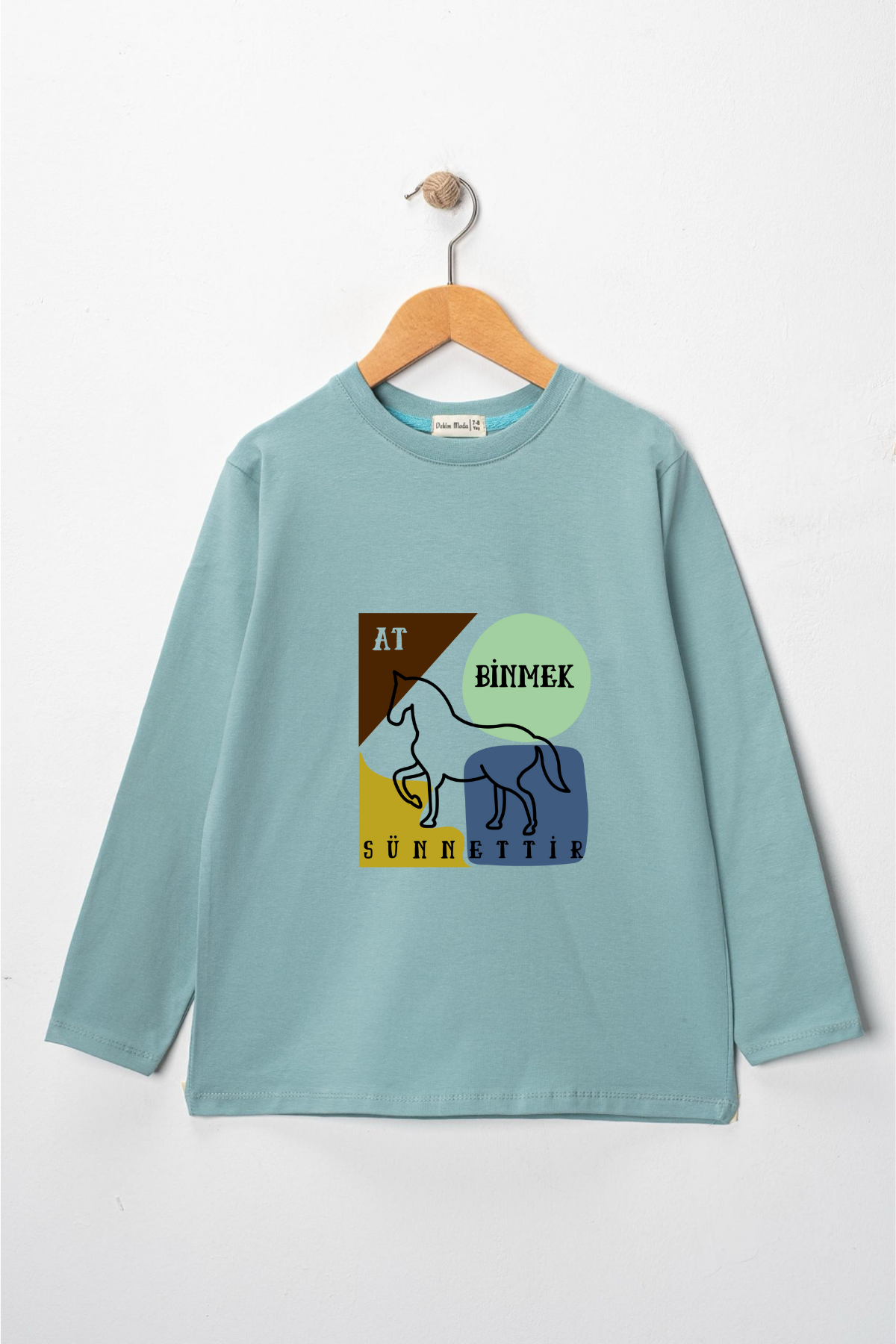 Uzun kollu, pamuklu, bisiklet yaka, "At Binmek Sünnettir" baskılı özel tasarım üründür. Çocuk fıtratına uygun, çocukların sevebileceği görseller kullanılarak tasarlanmıştır.