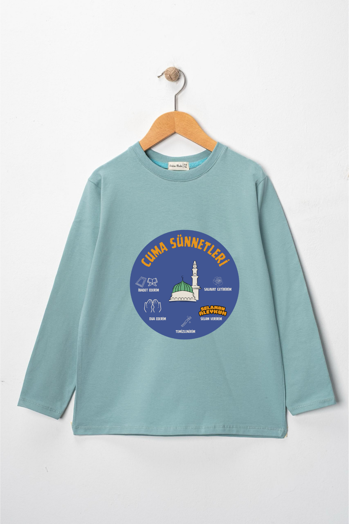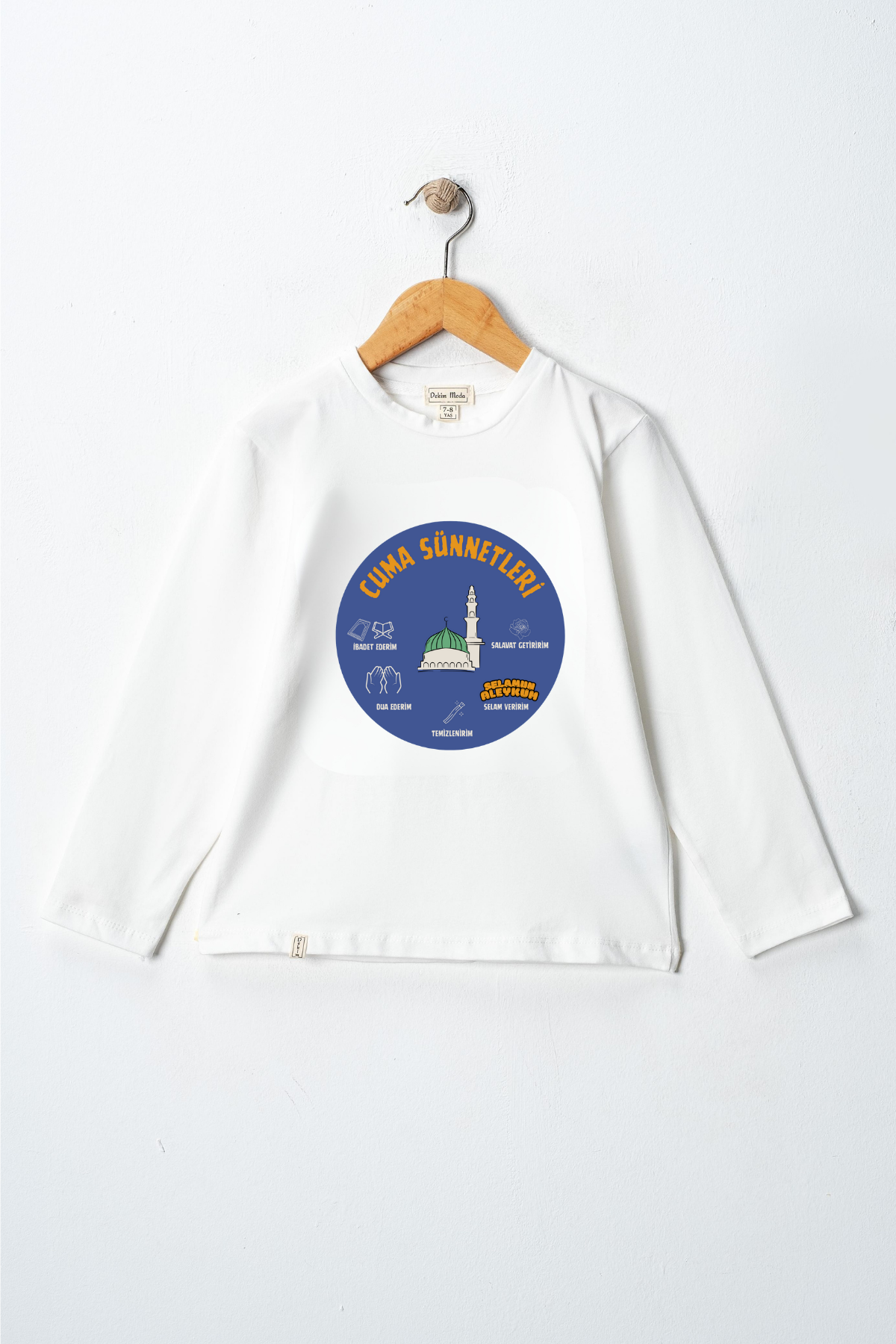 Uzun kollu, pamuklu, bisiklet yaka, "Cuma Sünnetleri" baskılı özel tasarım üründür. Çocuk fıtratına uygun, çocukların sevebileceği görseller kullanılarak tasarlanmıştır.