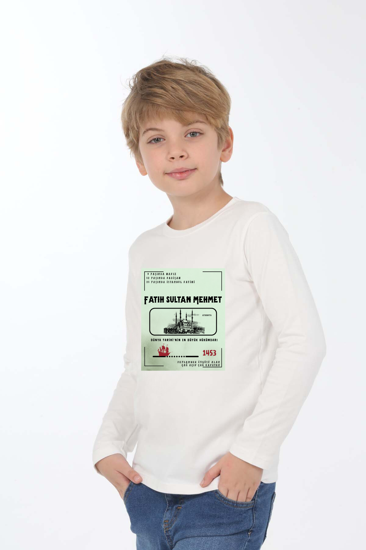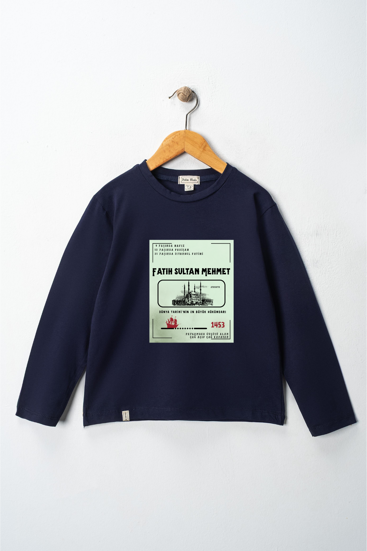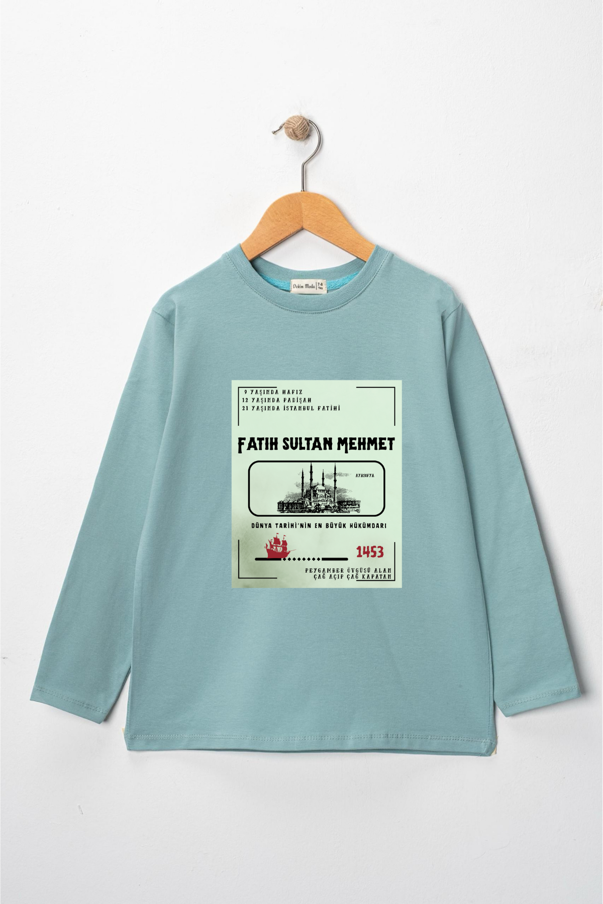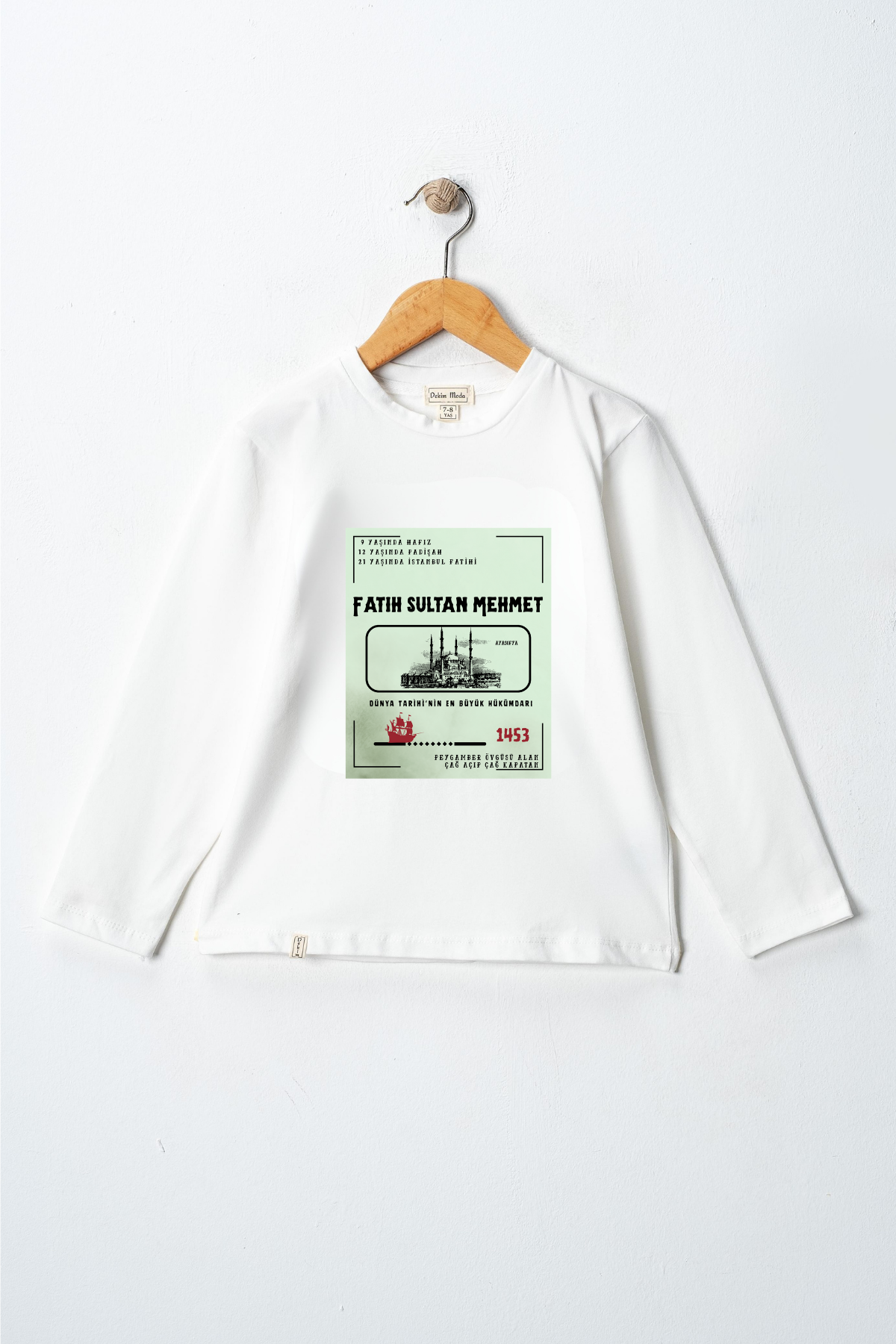 Uzun kollu, pamuklu, bisiklet yaka, "Fatih Sultan Mehmet"  baskılı özel tasarım üründür. Çocuk fıtratına uygun, çocukların sevebileceği görseller kullanılarak tasarlanmıştır.