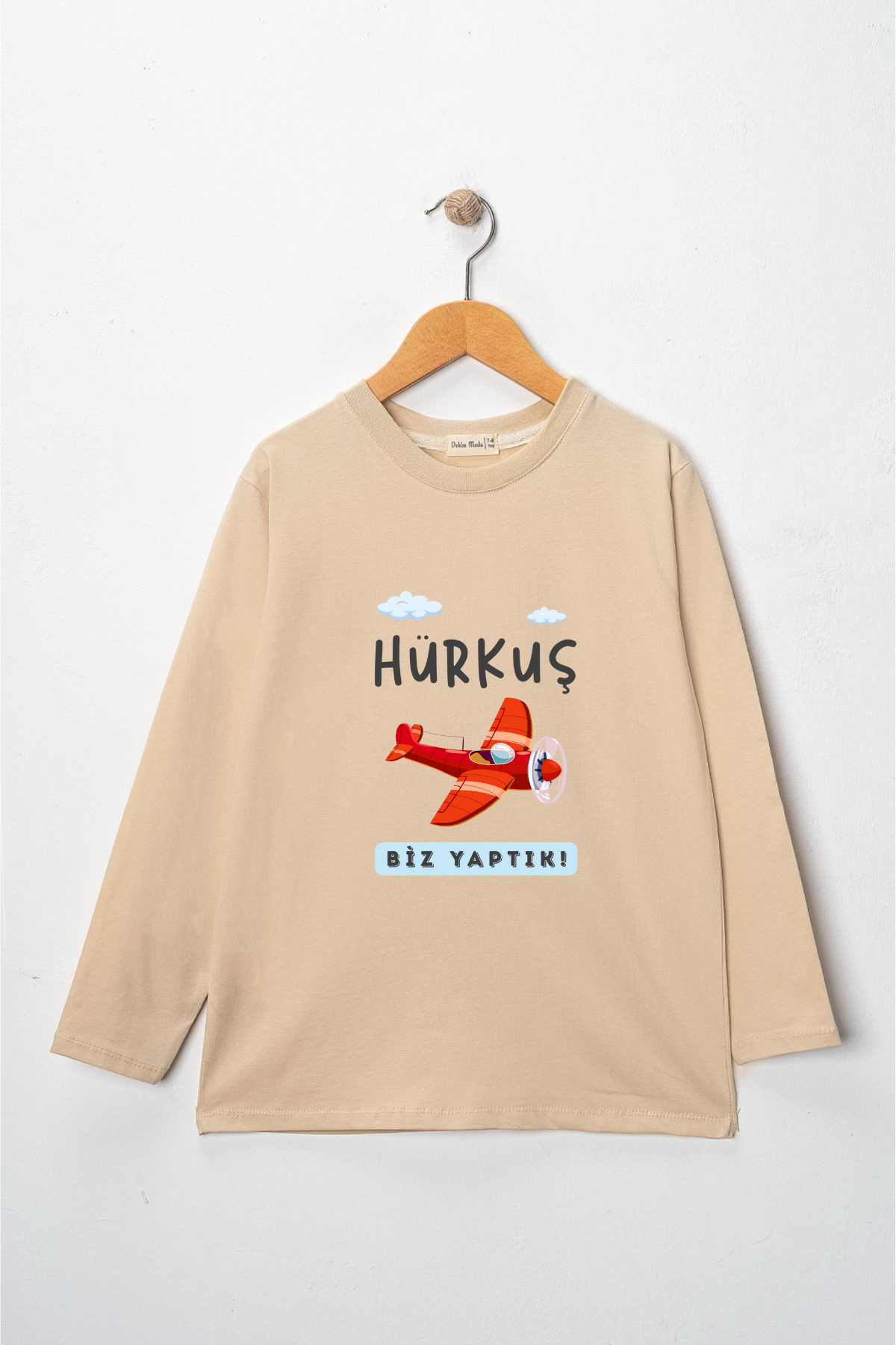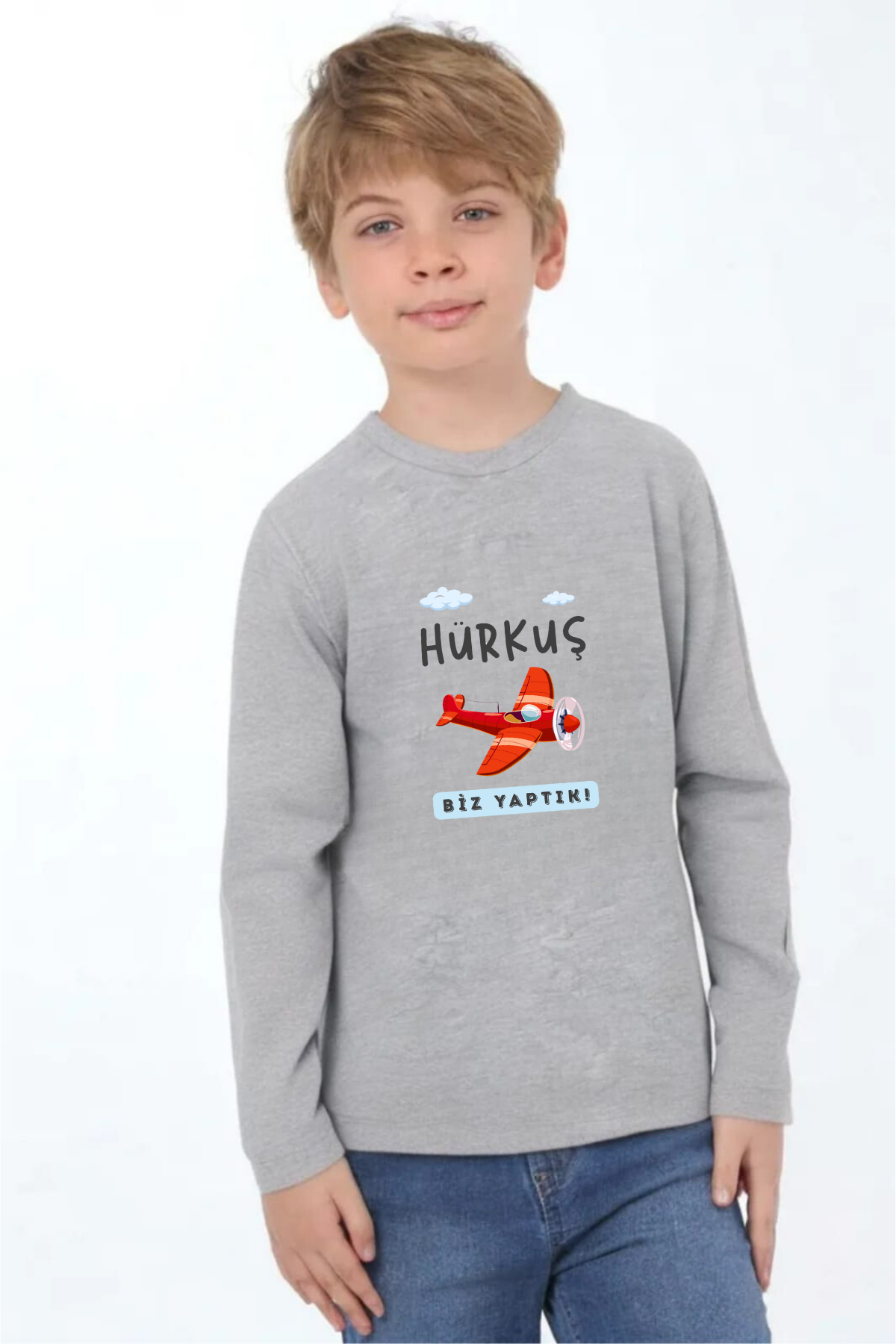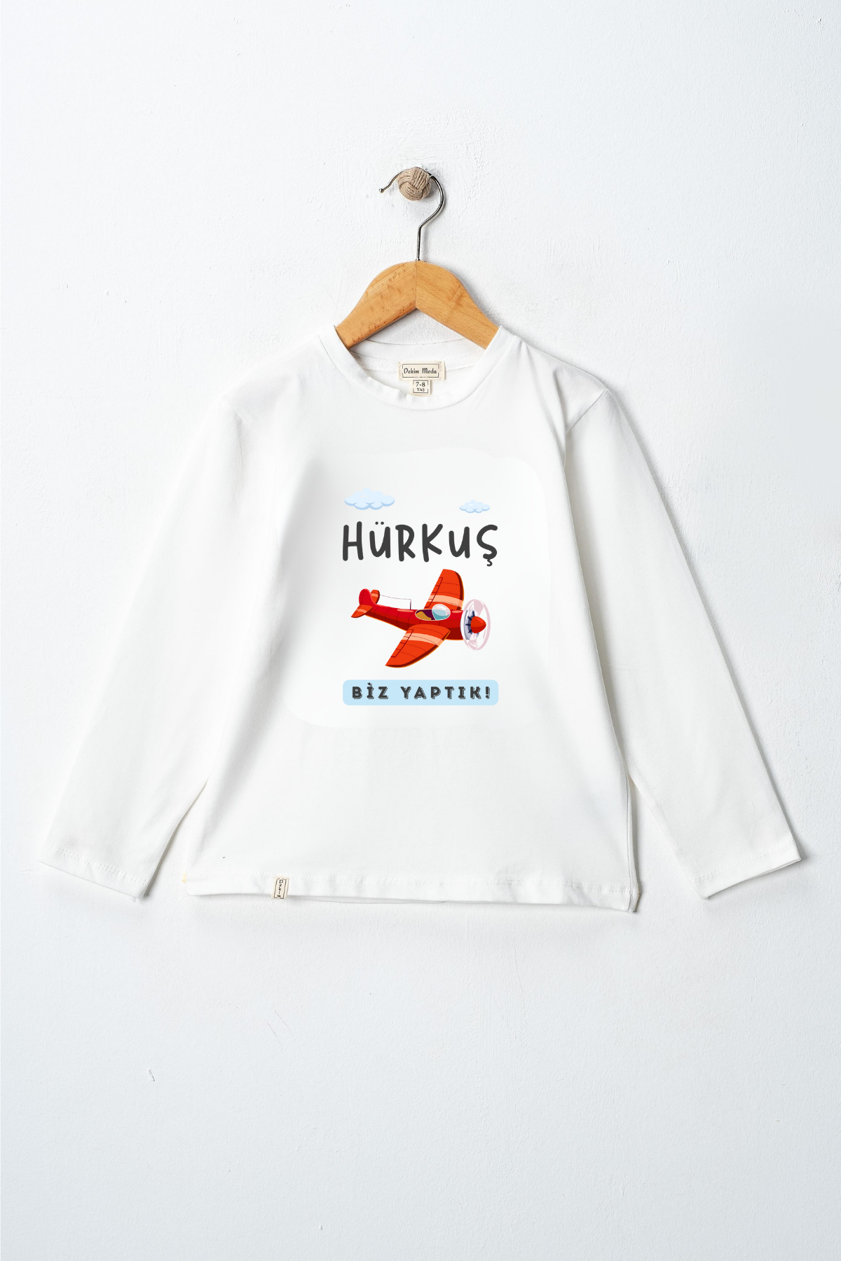 Uzun kollu, pamuklu, bisiklet yaka, "Hürkuş Biz Yaptık" baskılı özel tasarım üründür. Çocuk fıtratına uygun, çocukların sevebileceği görseller kullanılarak tasarlanmıştır.