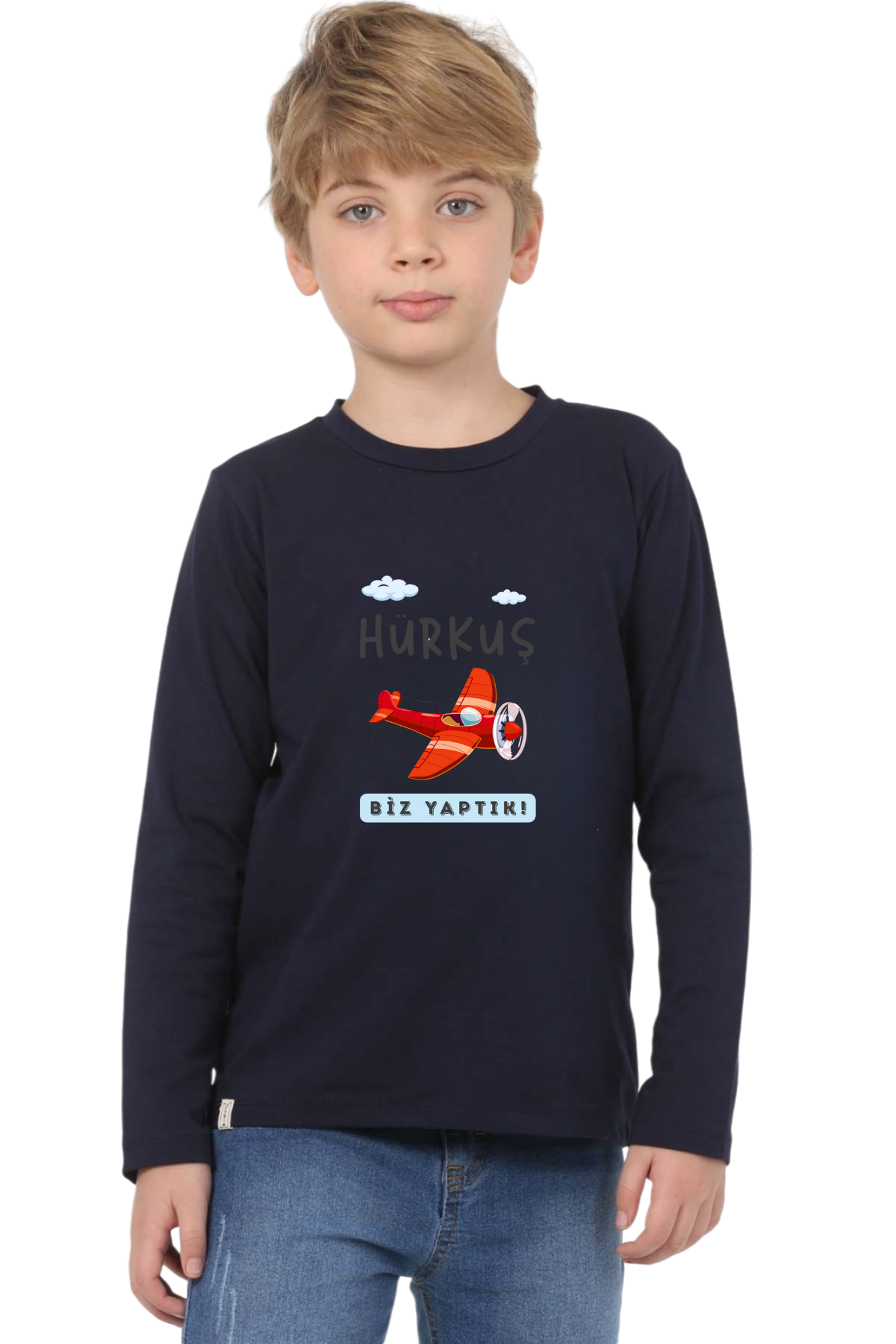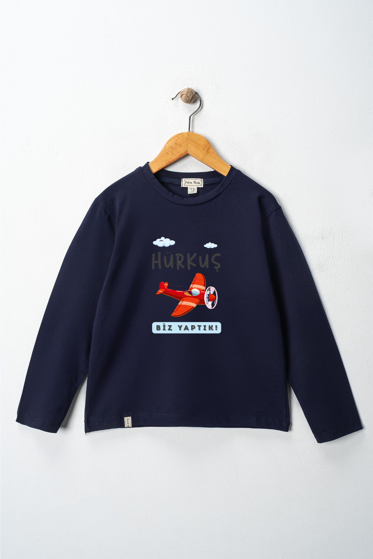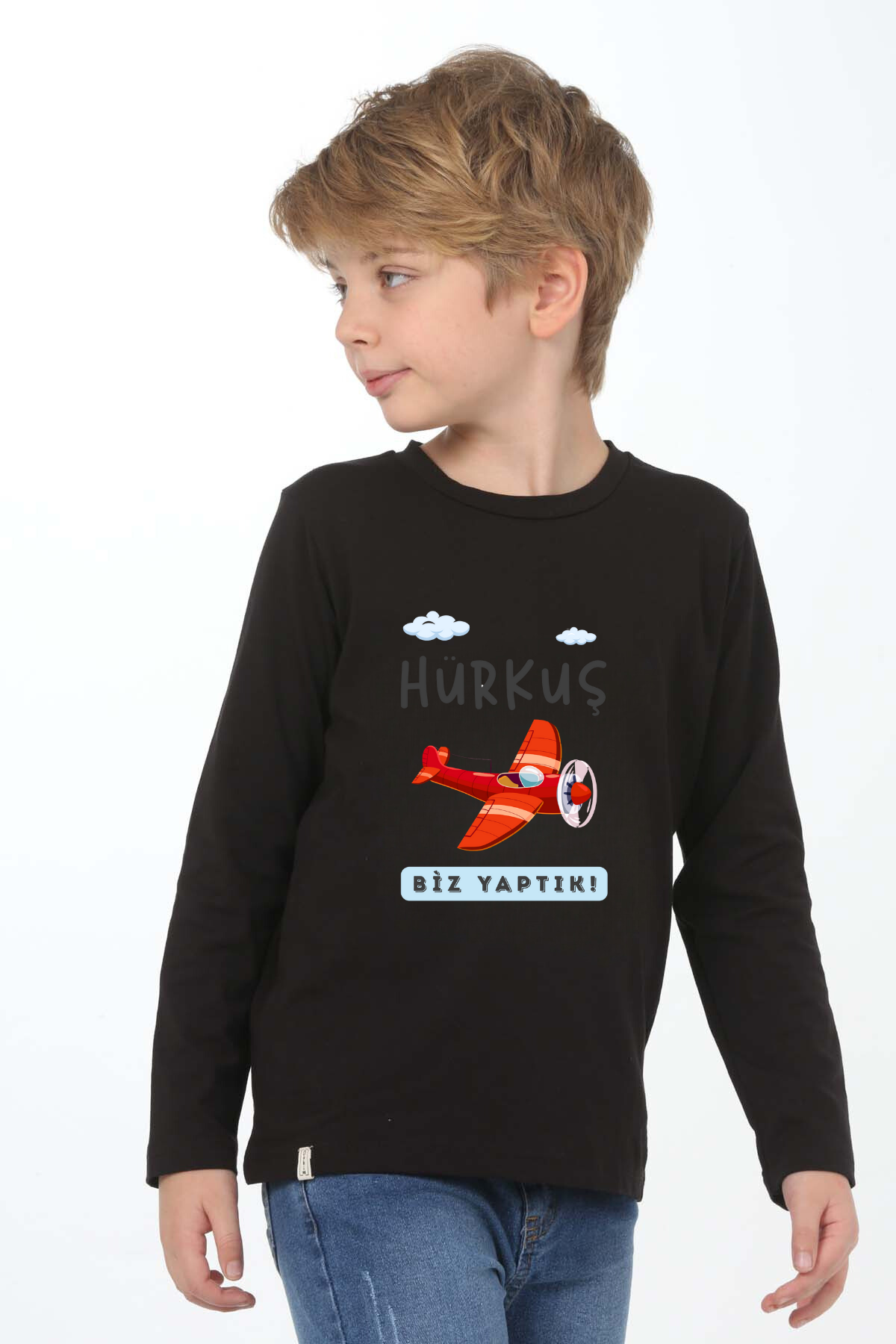 Uzun kollu, pamuklu, bisiklet yaka, "Hürkuş Biz Yaptık" baskılı özel tasarım üründür. Çocuk fıtratına uygun, çocukların sevebileceği görseller kullanılarak tasarlanmıştır.