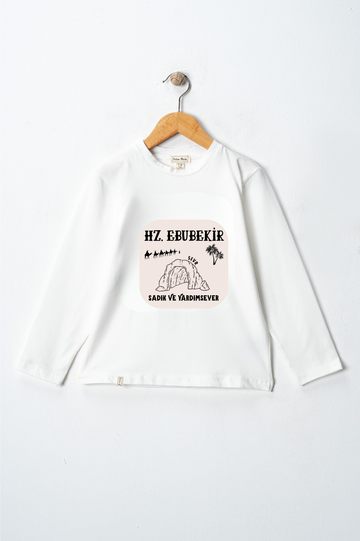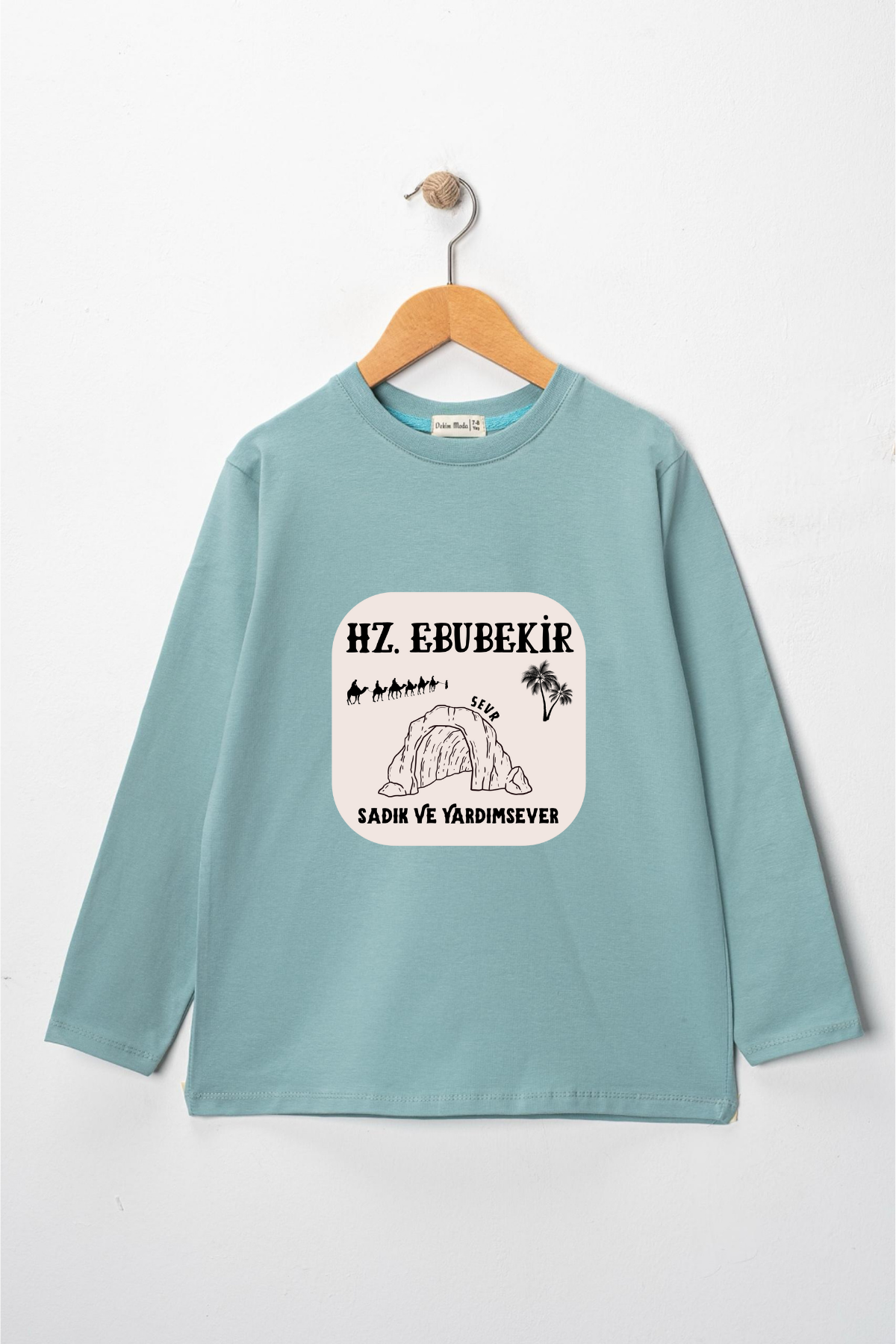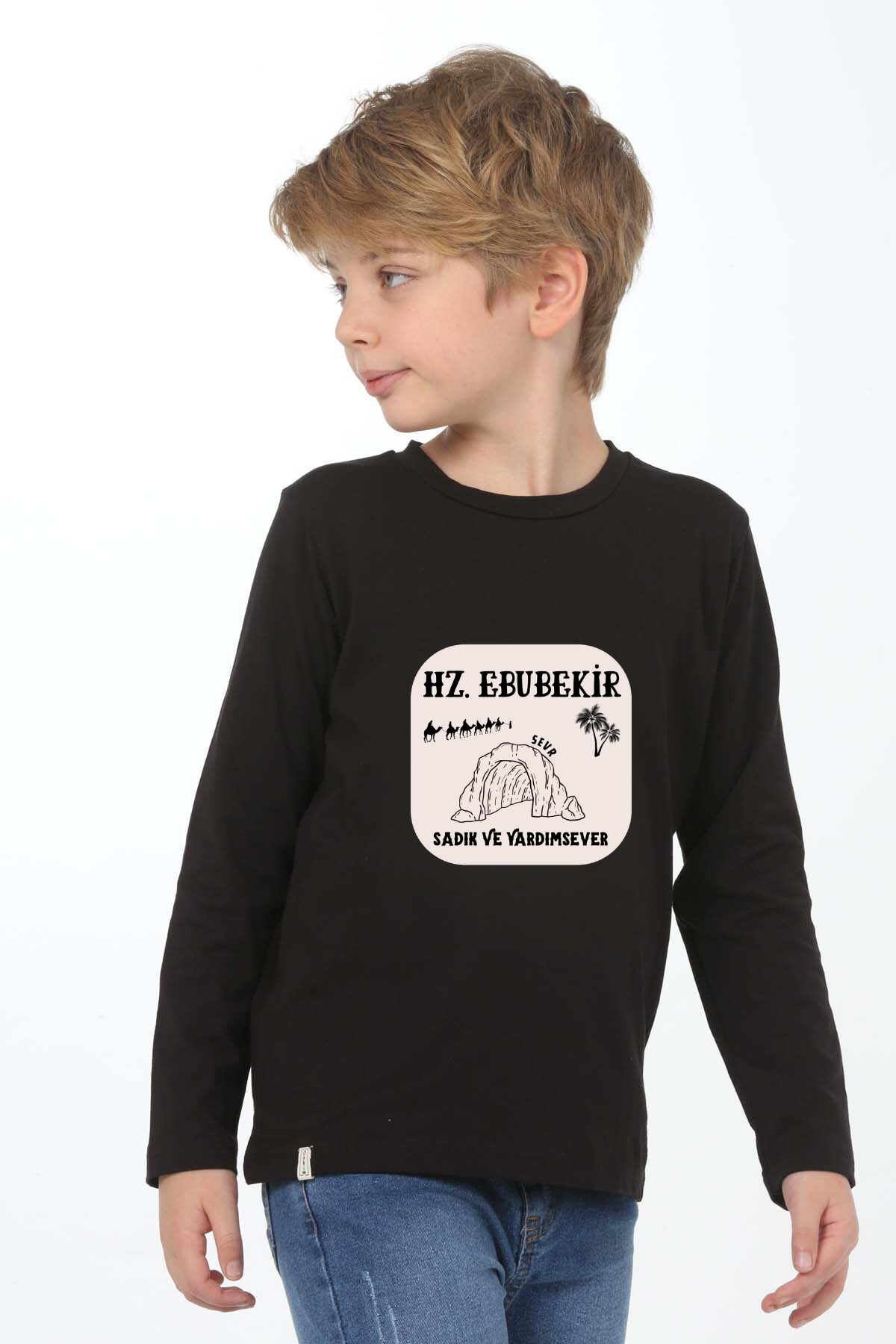 Uzun kollu, pamuklu, bisiklet yaka, "Hz Ebubekir" baskılı özel tasarım üründür. Çocuk fıtratına uygun, çocukların sevebileceği görseller kullanılarak tasarlanmıştır.