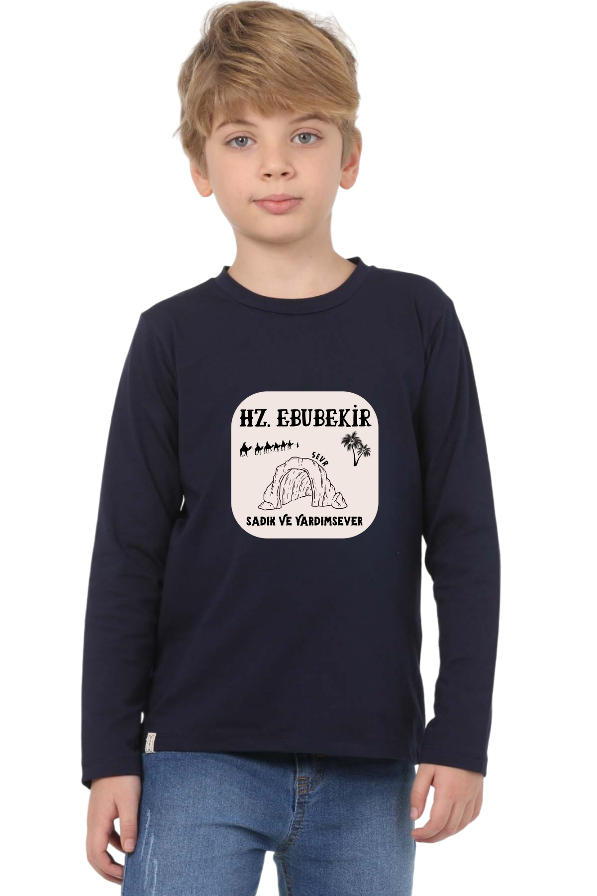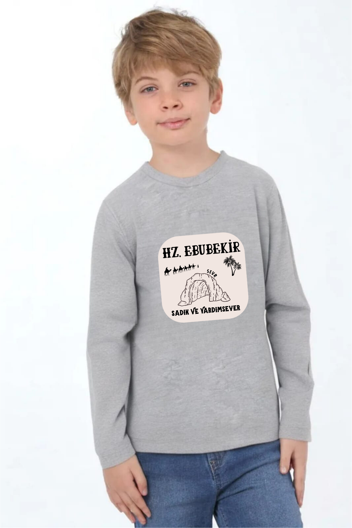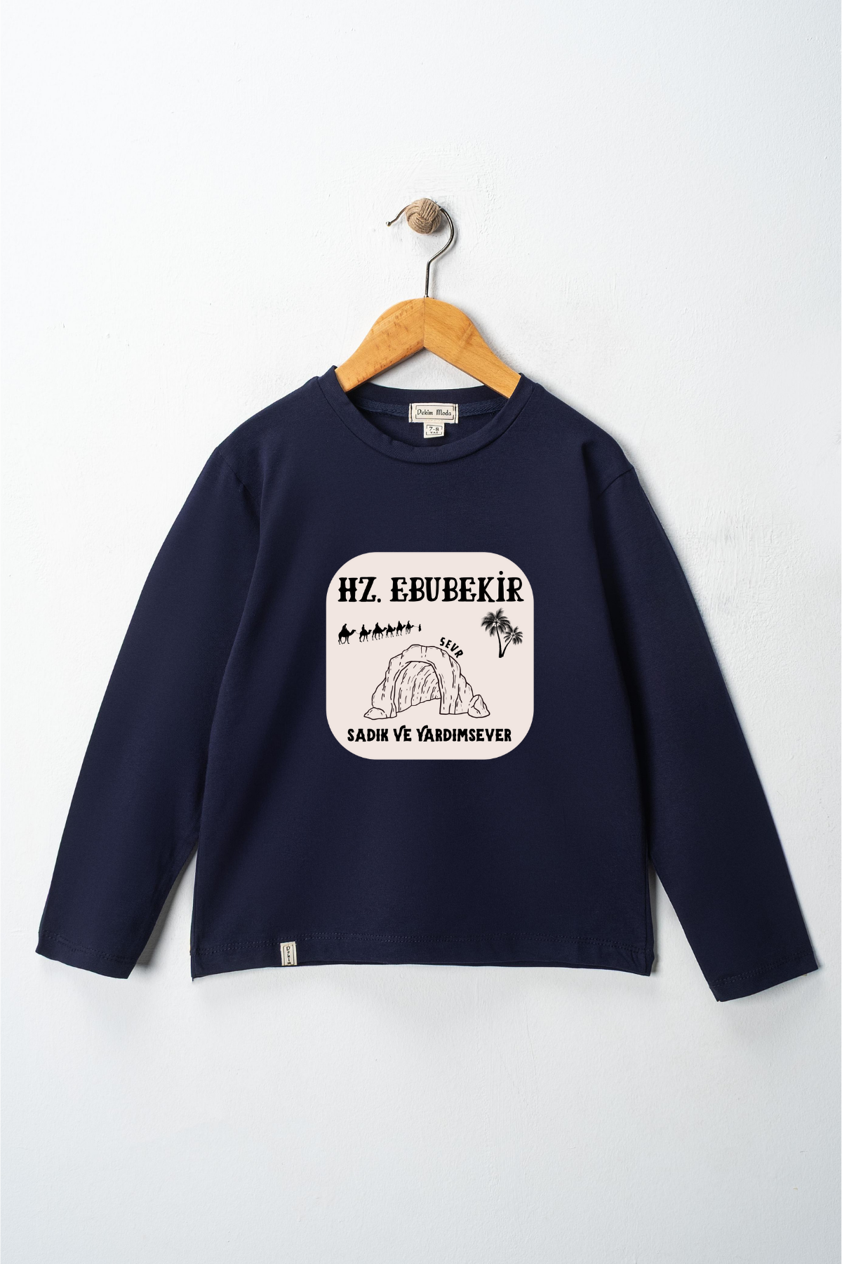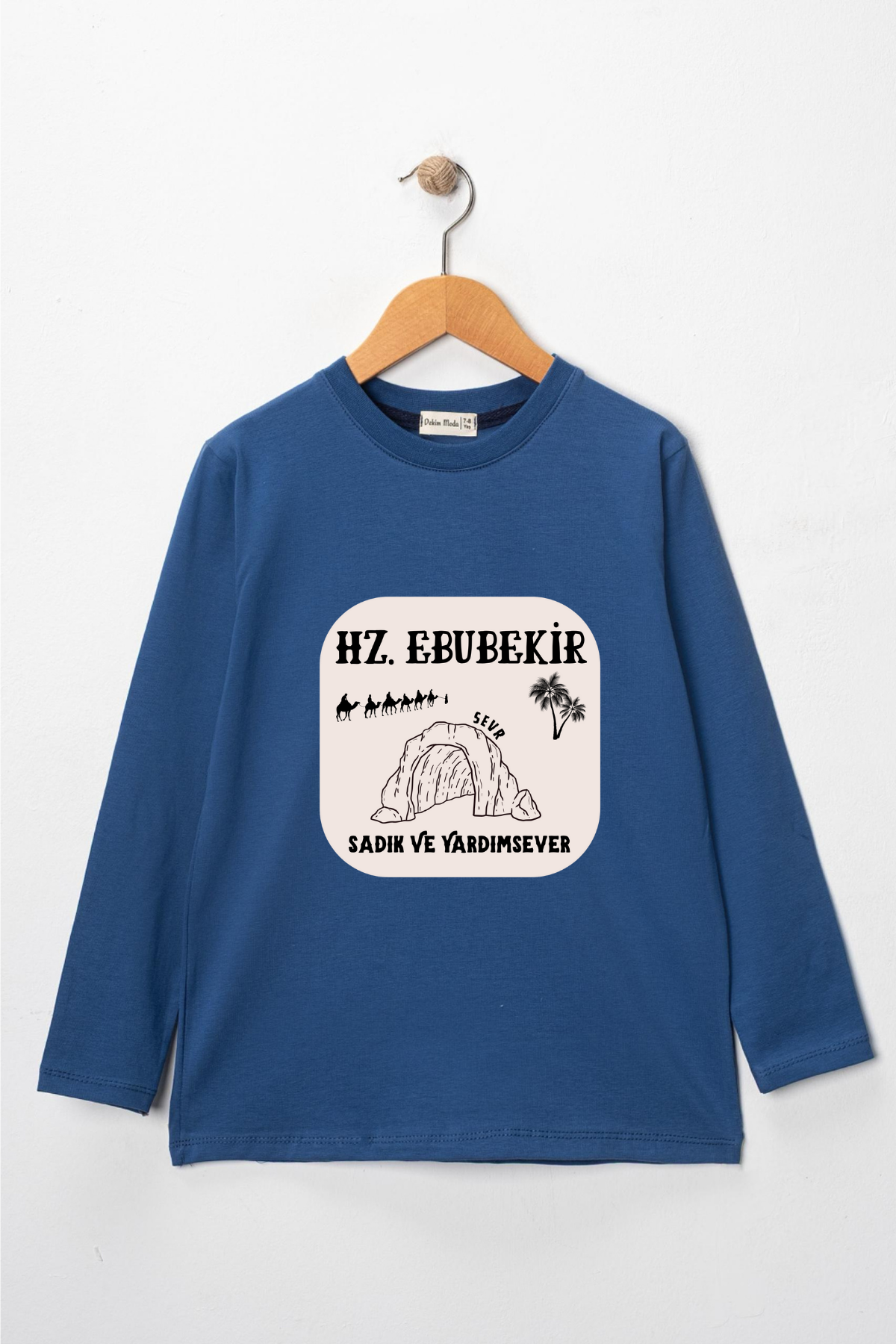 Uzun kollu, pamuklu, bisiklet yaka, "Hz Ebubekir" baskılı özel tasarım üründür. Çocuk fıtratına uygun, çocukların sevebileceği görseller kullanılarak tasarlanmıştır.