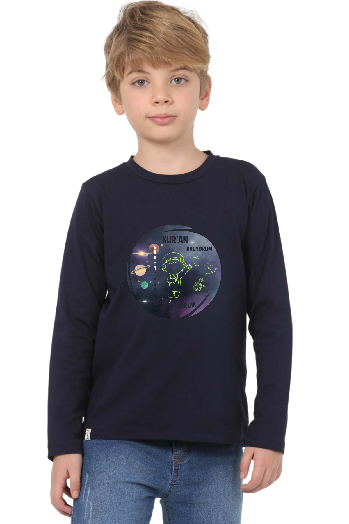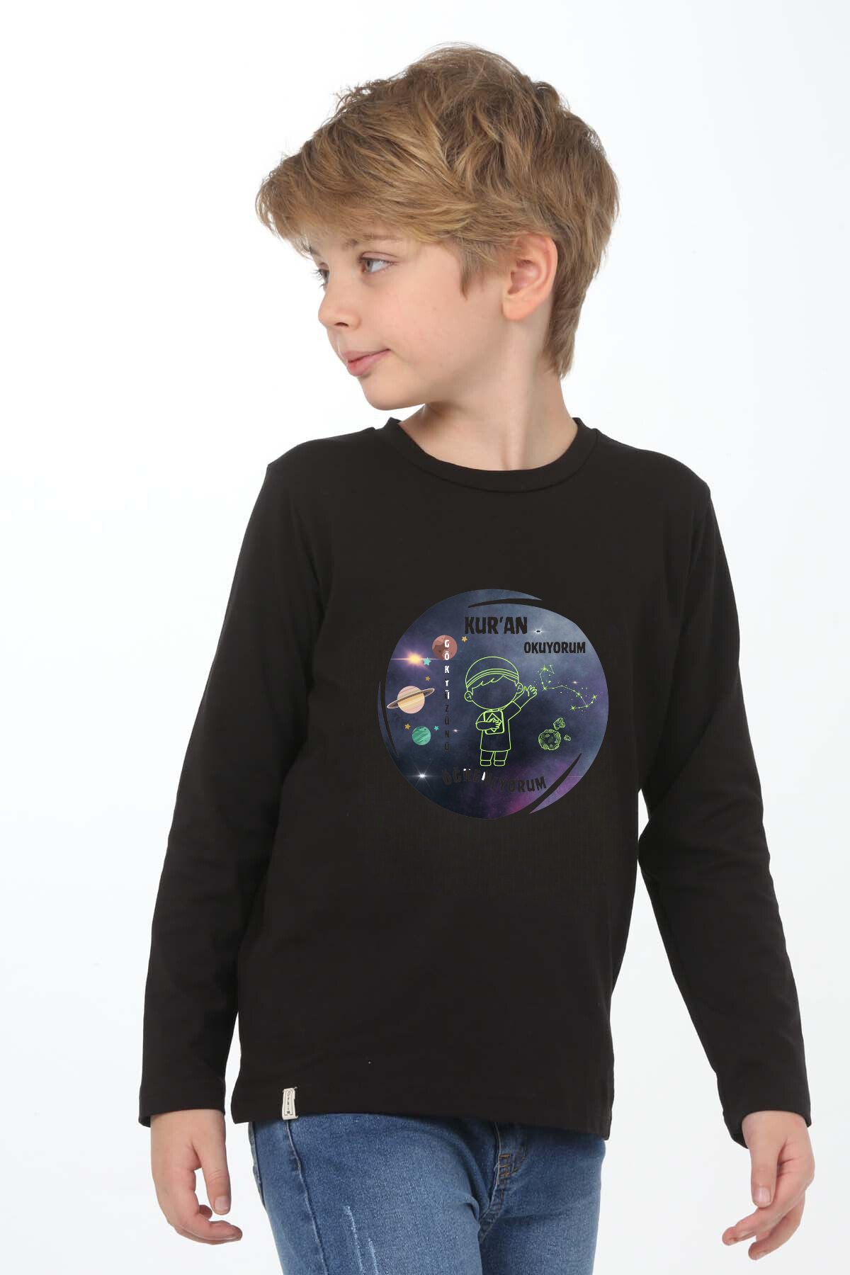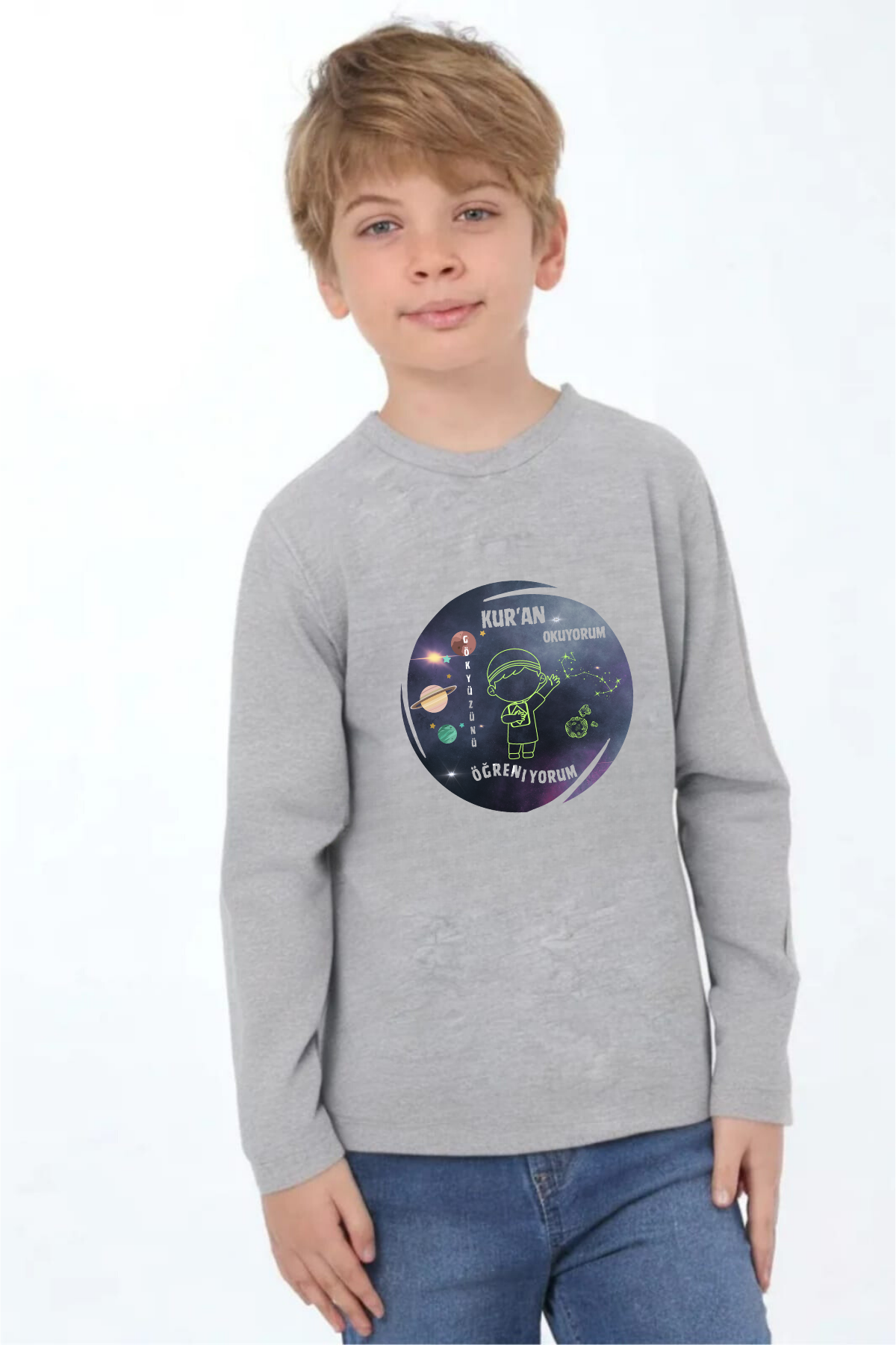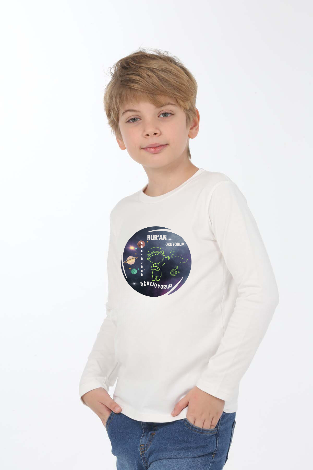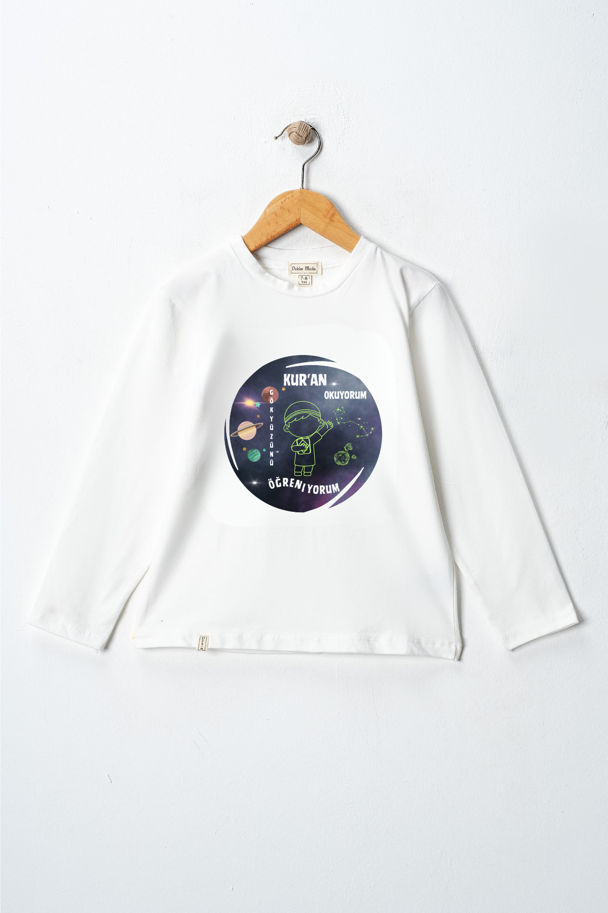 Uzun kollu, pamuklu, bisiklet yaka, "Kuran Okuyorum, Uzayı Öğreniyorum" baskılı özel tasarım üründür. Çocuk fıtratına uygun, çocukların sevebileceği görseller kullanılarak tasarlanmıştır.