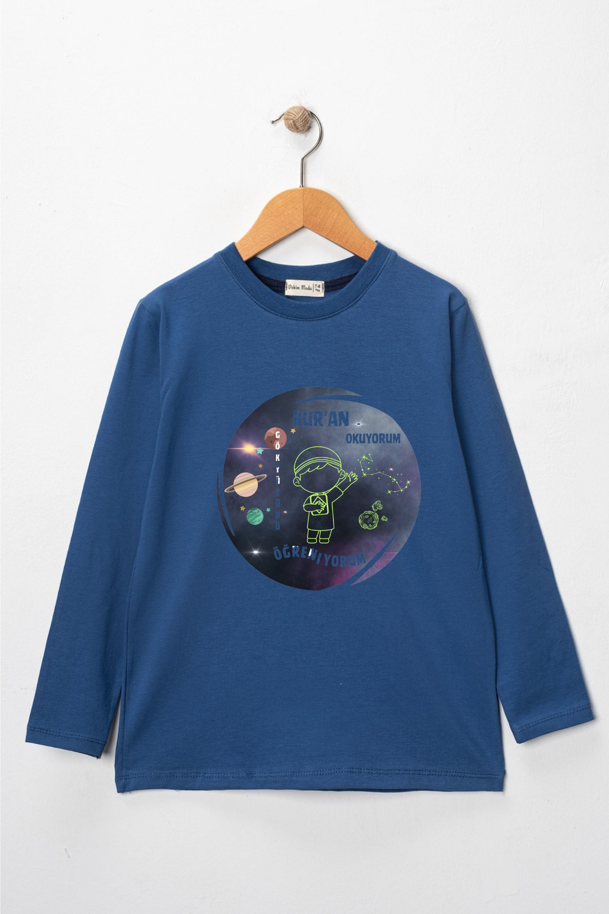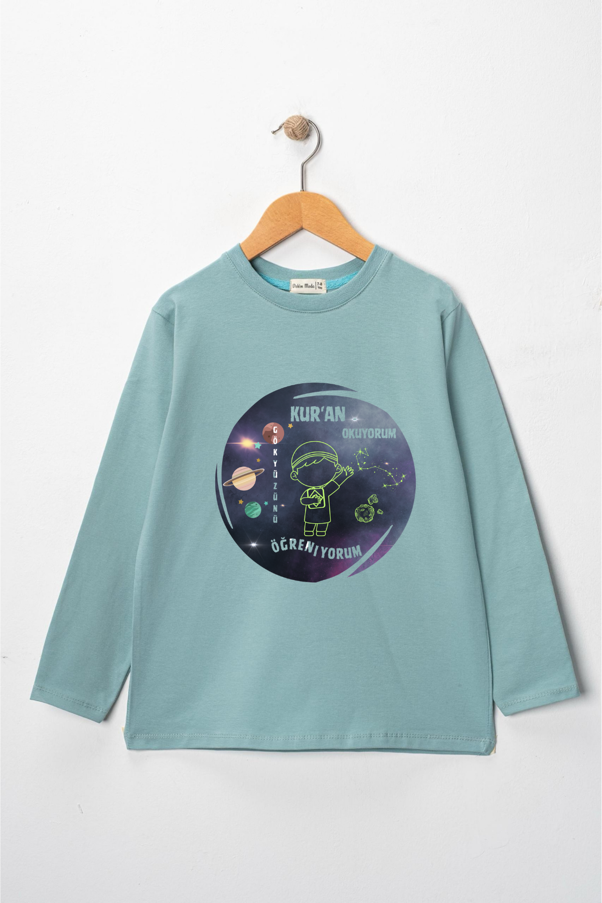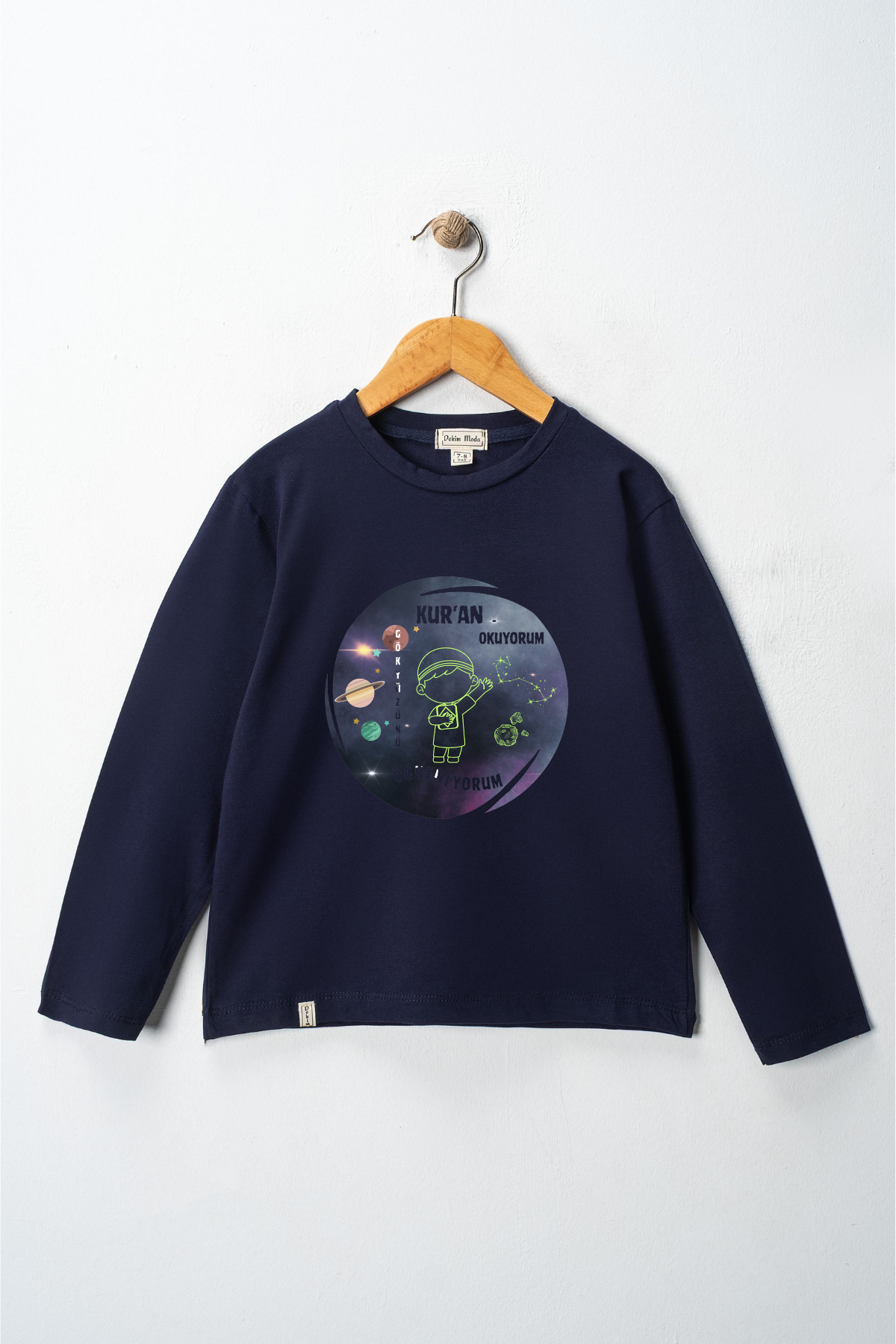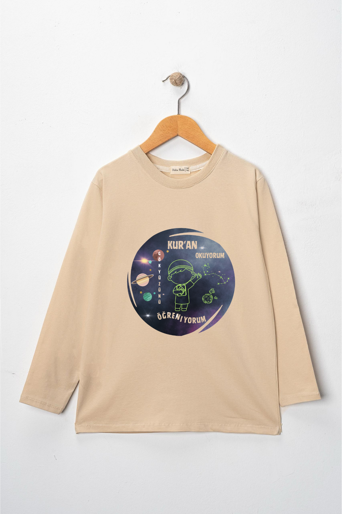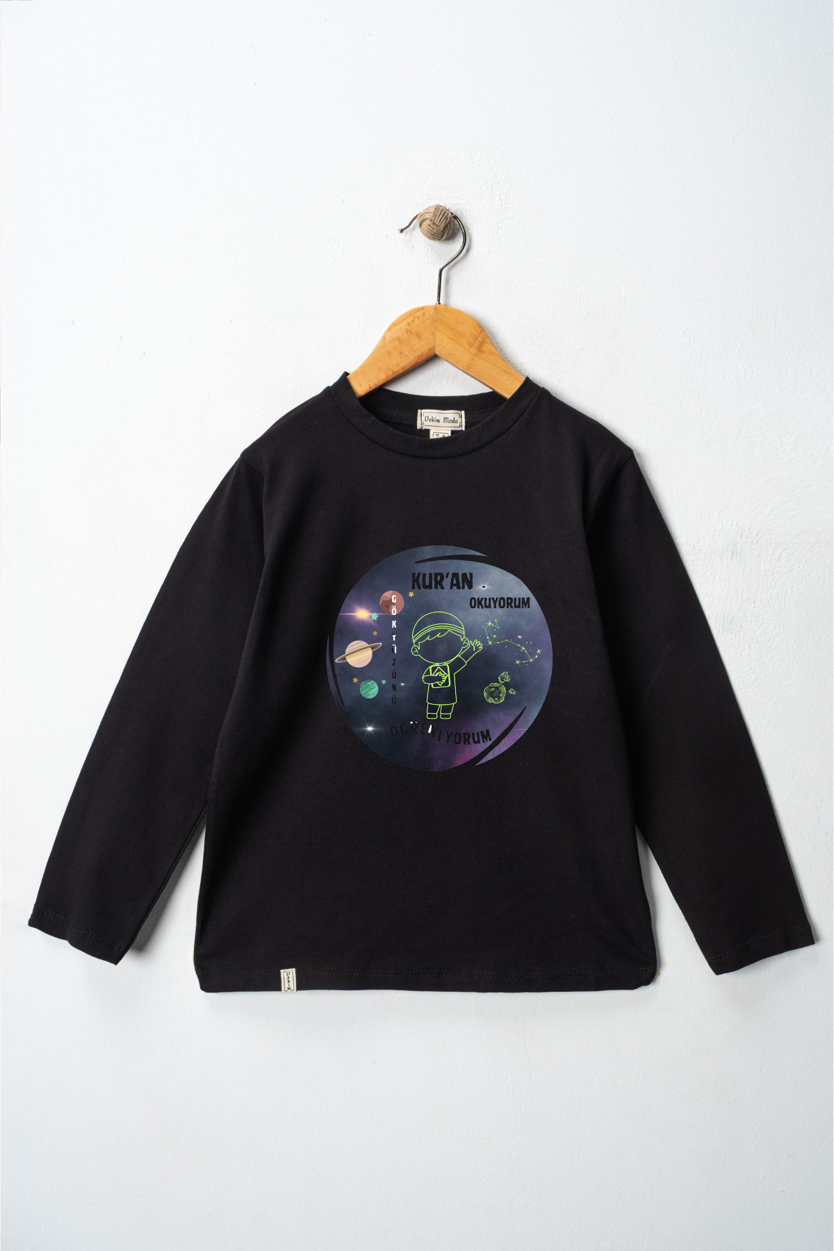 Uzun kollu, pamuklu, bisiklet yaka, "Kuran Okuyorum, Uzayı Öğreniyorum" baskılı özel tasarım üründür. Çocuk fıtratına uygun, çocukların sevebileceği görseller kullanılarak tasarlanmıştır.
