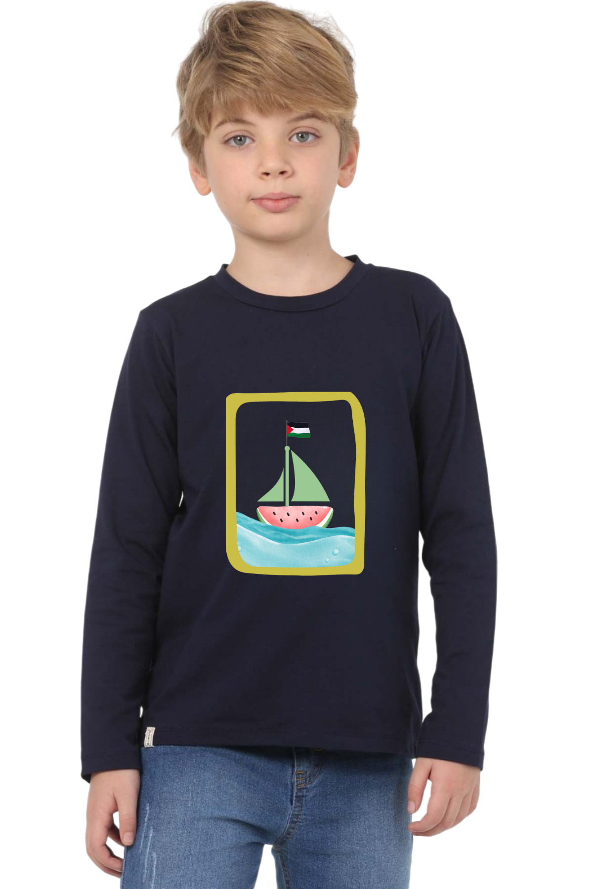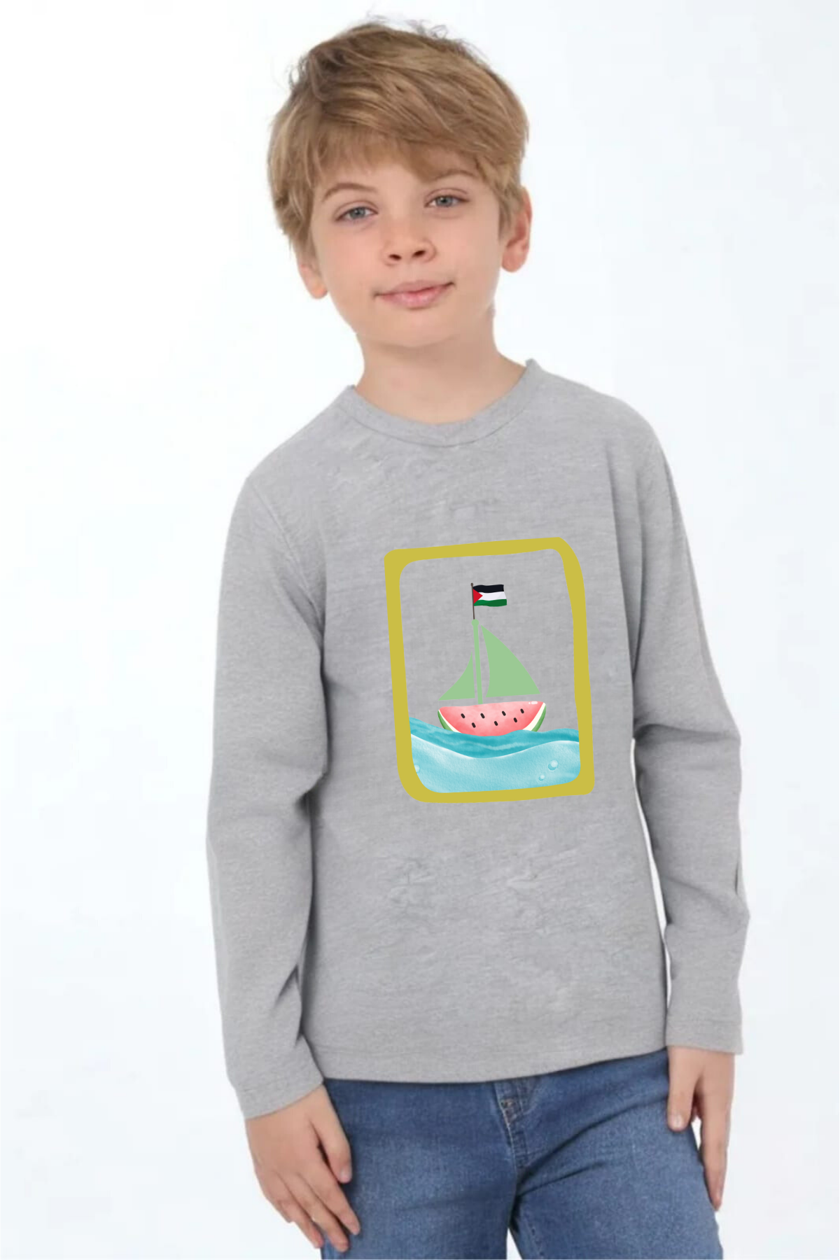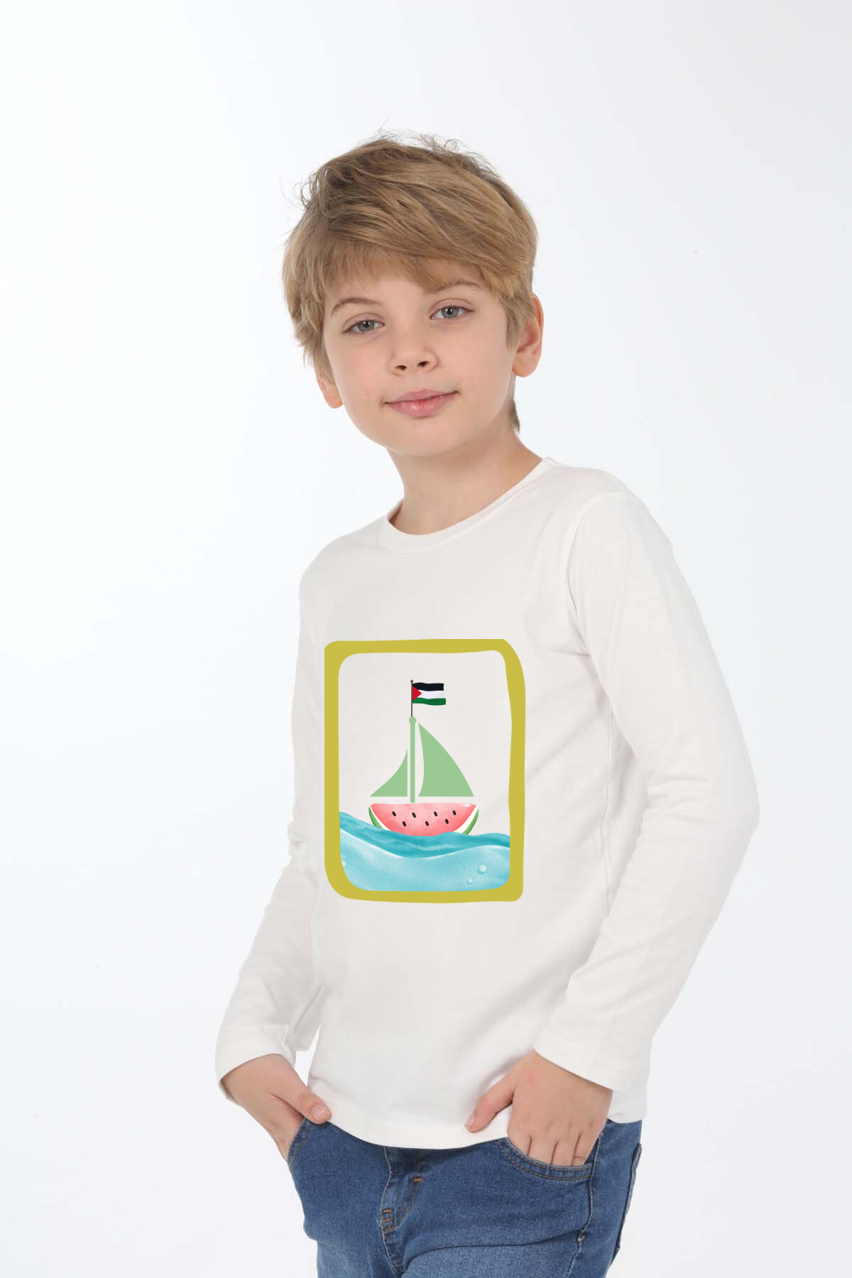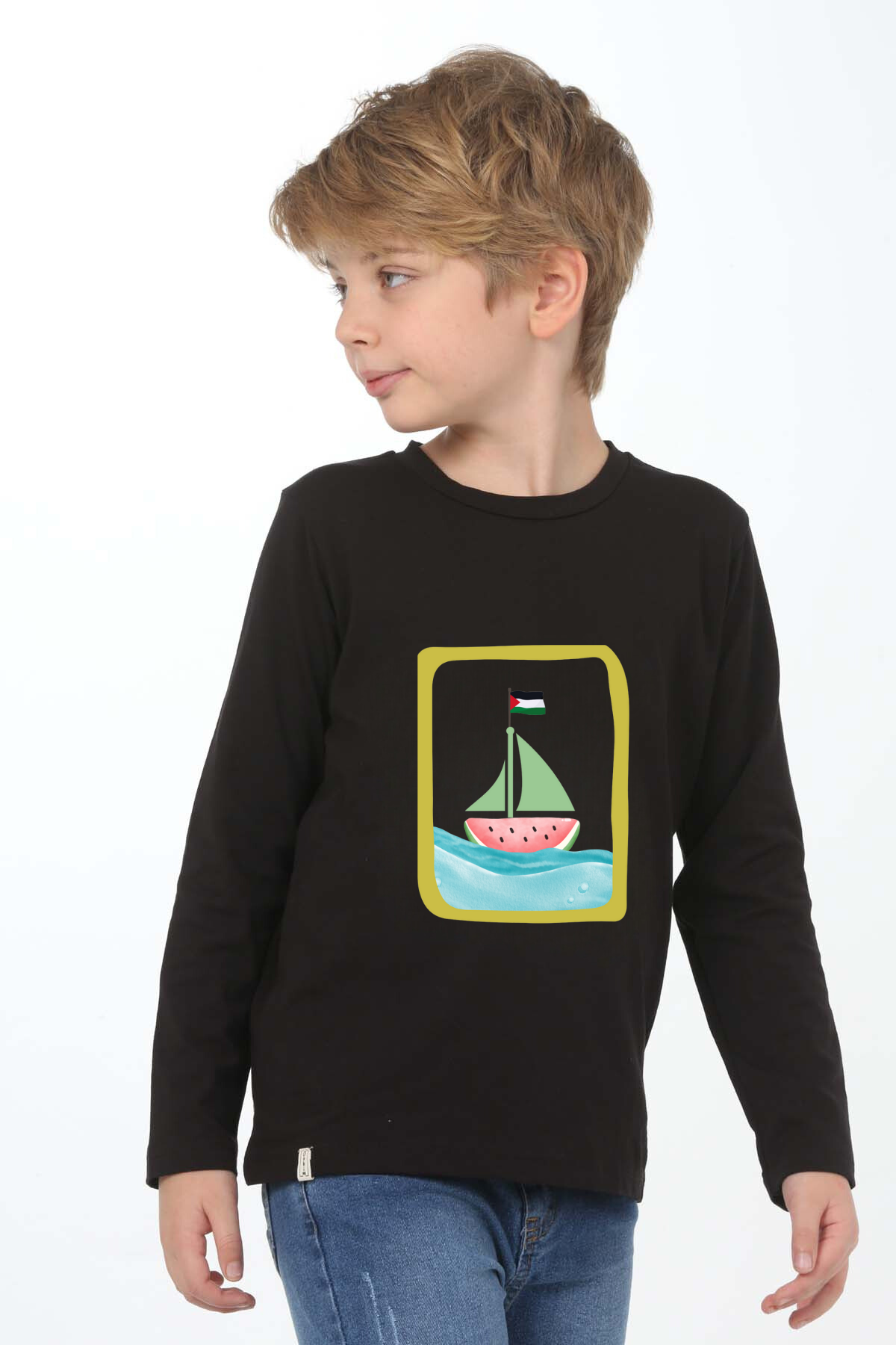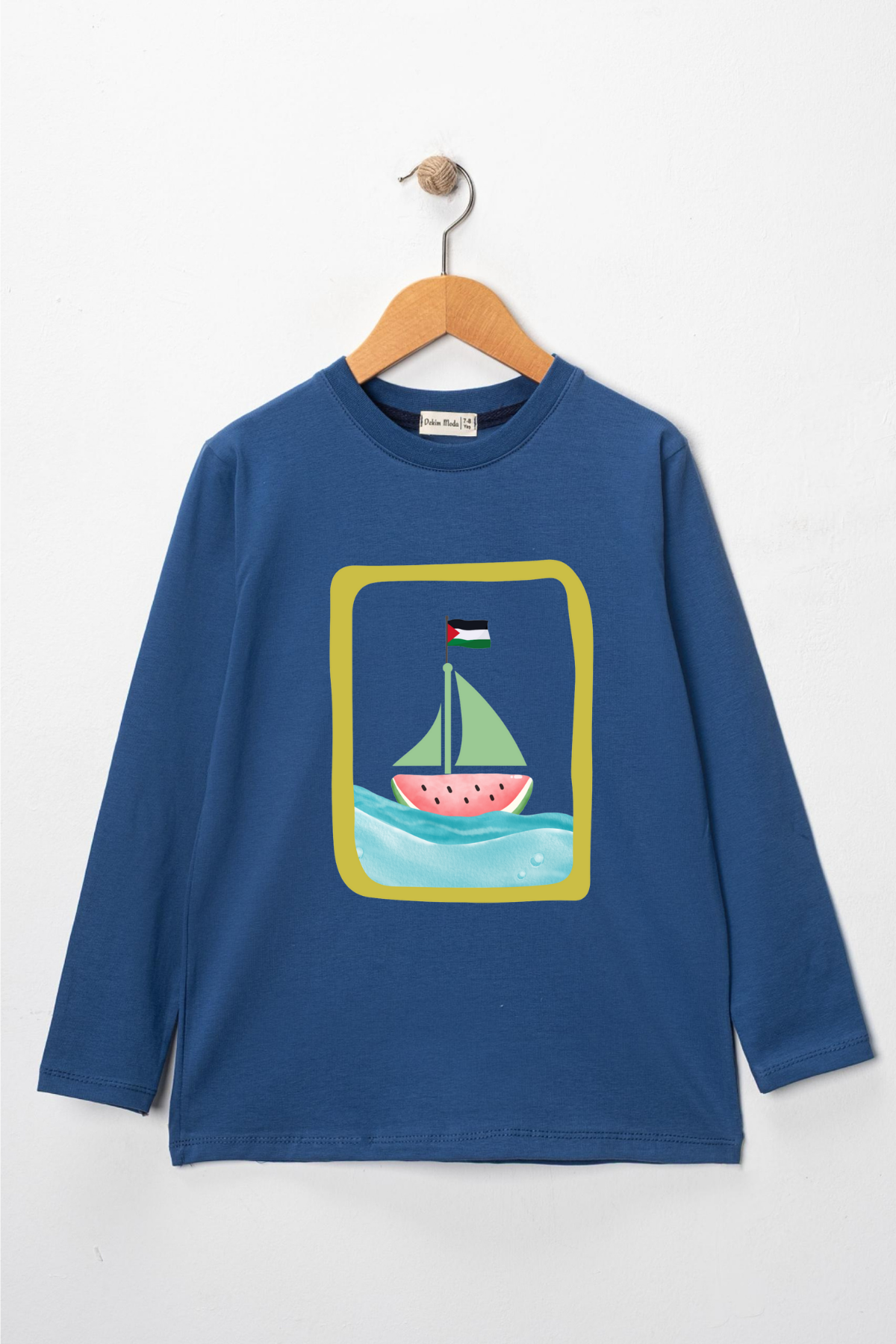 Uzun kollu, pamuklu, bisiklet yaka, "Filistin, Gazze Gemi" baskılı özel tasarım üründür. Çocuk fıtratına uygun, çocukların sevebileceği görseller kullanılarak tasarlanmıştır.