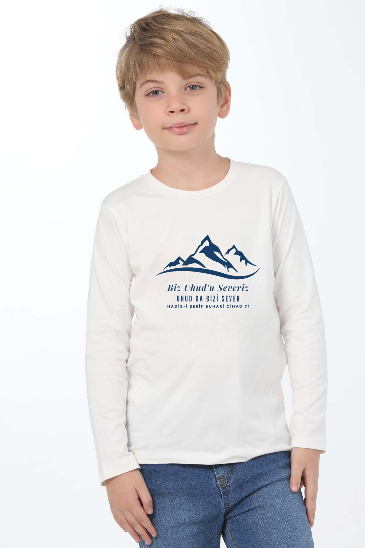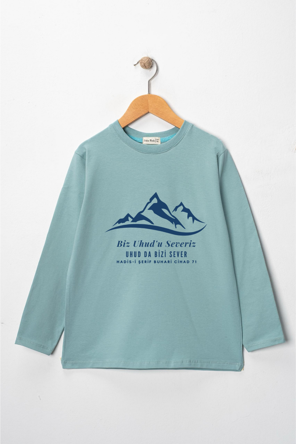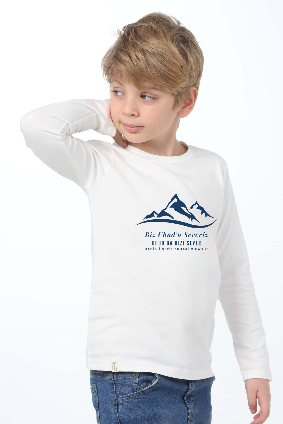 Uzun kollu, pamuklu, bisiklet yaka, baskılı İslami tema Uhud Bizi Sever Biz de Uhud'u severiz Hadis-i Şerif baskılı özel tasarım üründür. Çocuk fıtratına uygun, çocukların sevebileceği görseller kullanılarak tasarlanmıştır.