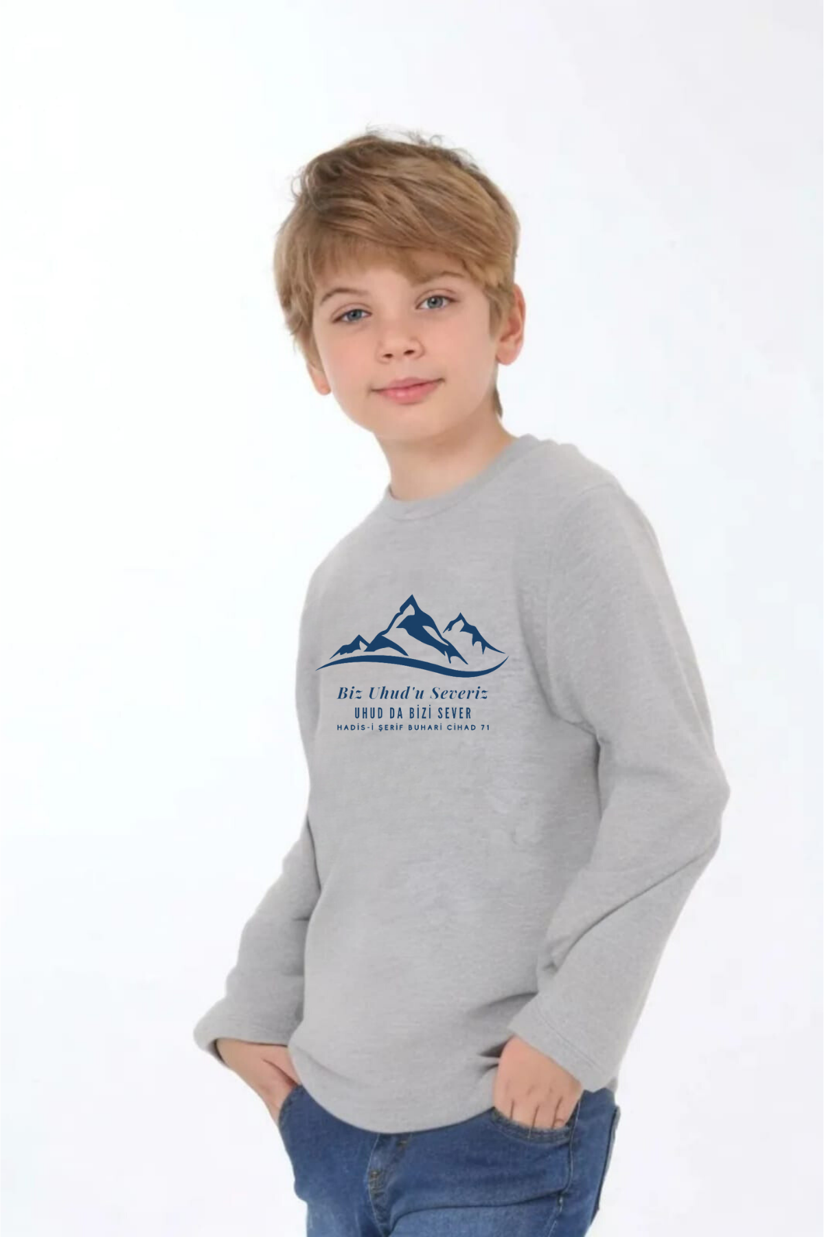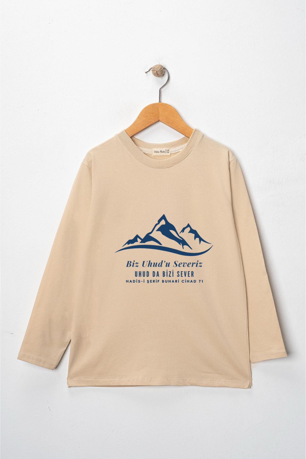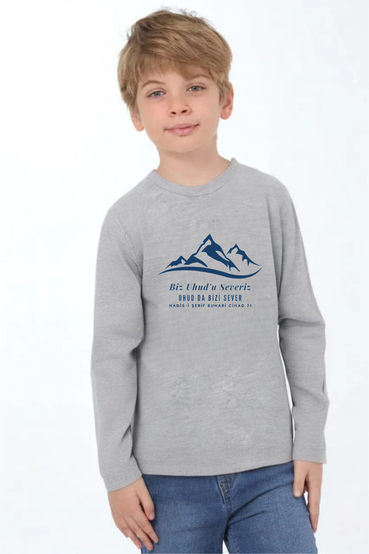 Uzun kollu, pamuklu, bisiklet yaka, baskılı İslami tema Uhud Bizi Sever Biz de Uhud'u severiz Hadis-i Şerif baskılı özel tasarım üründür. Çocuk fıtratına uygun, çocukların sevebileceği görseller kullanılarak tasarlanmıştır.