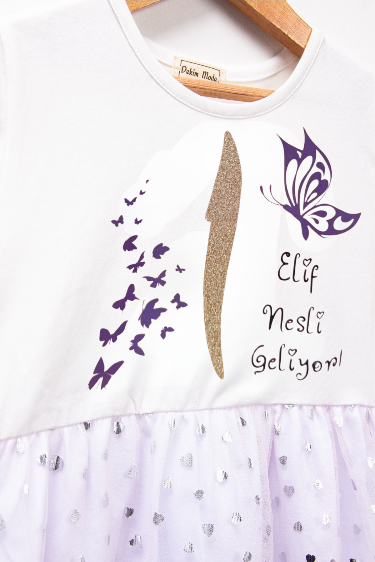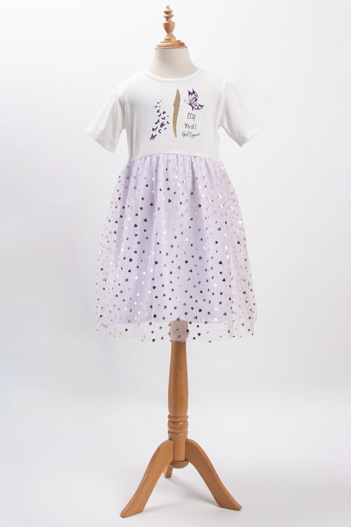 Kız Çocuk kısa kollu, pamuklu, bisiklet yaka, baskılı ve tüllü elbise.