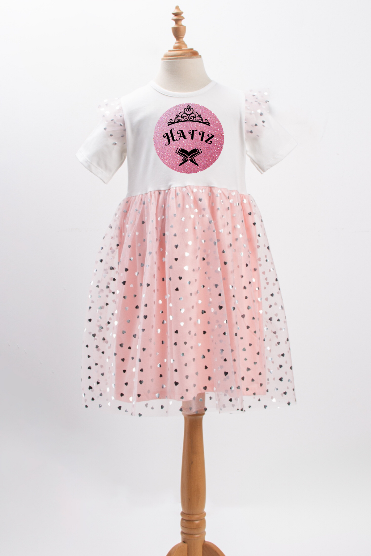 Kız Çocuk kısa kollu, pamuklu, bisiklet yaka, baskılı ve tüllü elbise.
