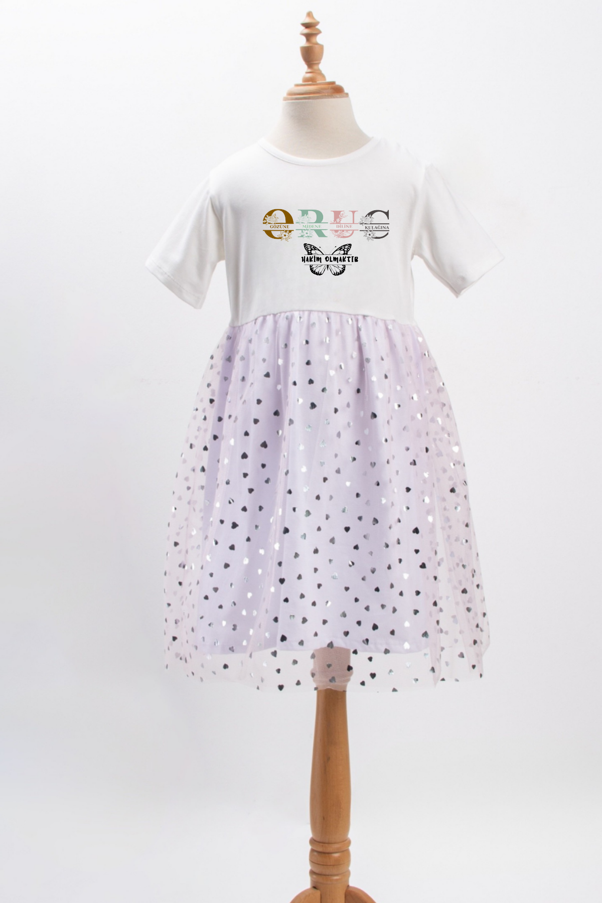 Kız Çocuk kısa kollu, pamuklu, bisiklet yaka, baskılı ve tüllü elbise.