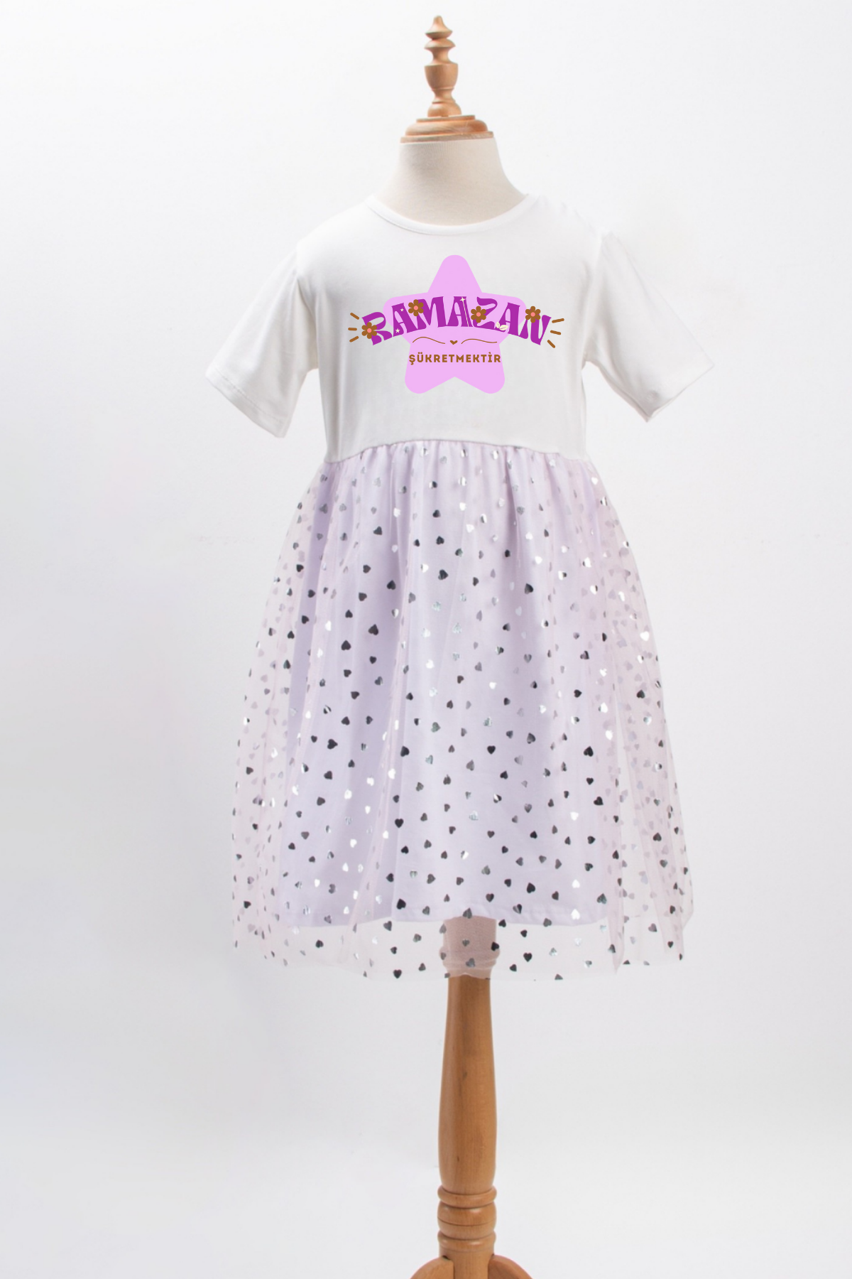 Kız Çocuk kısa kollu, pamuklu, bisiklet yaka, baskılı ve tüllü elbise.