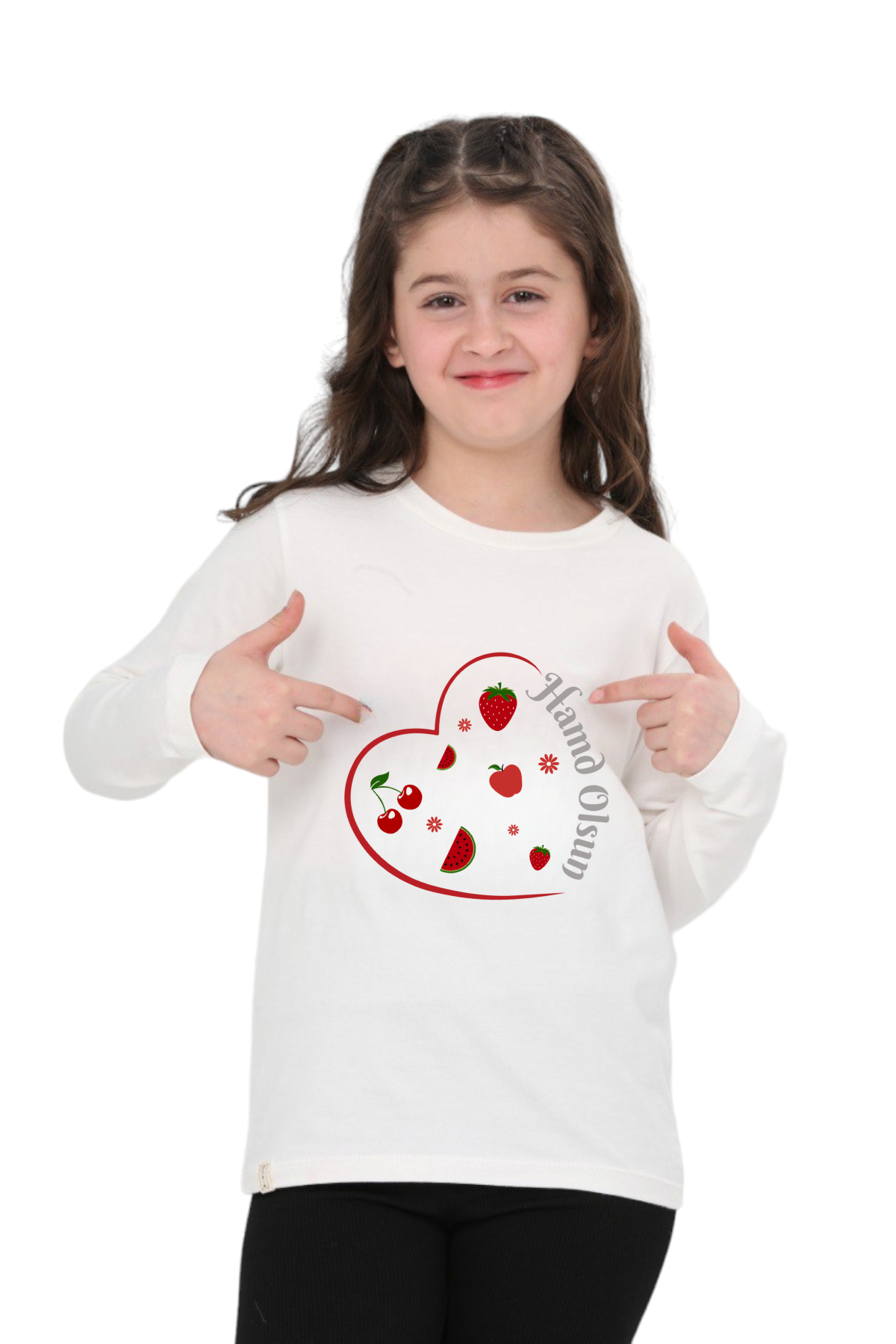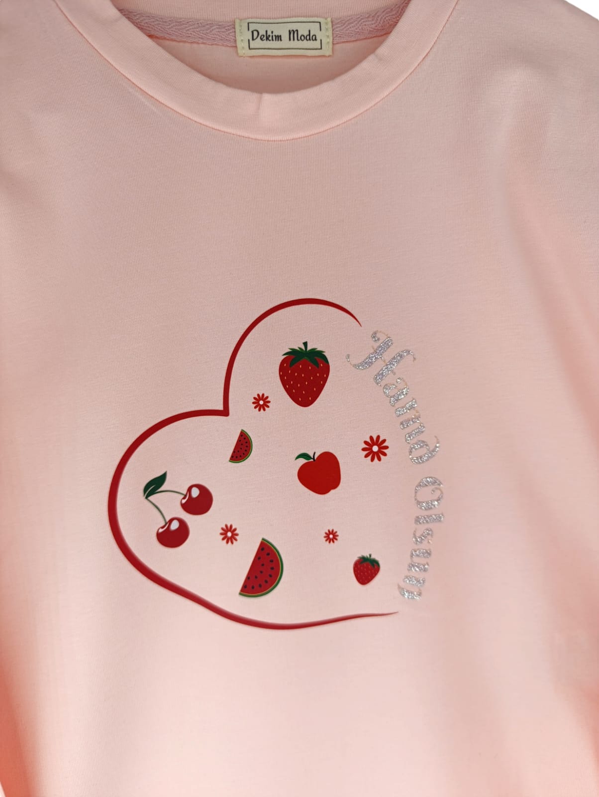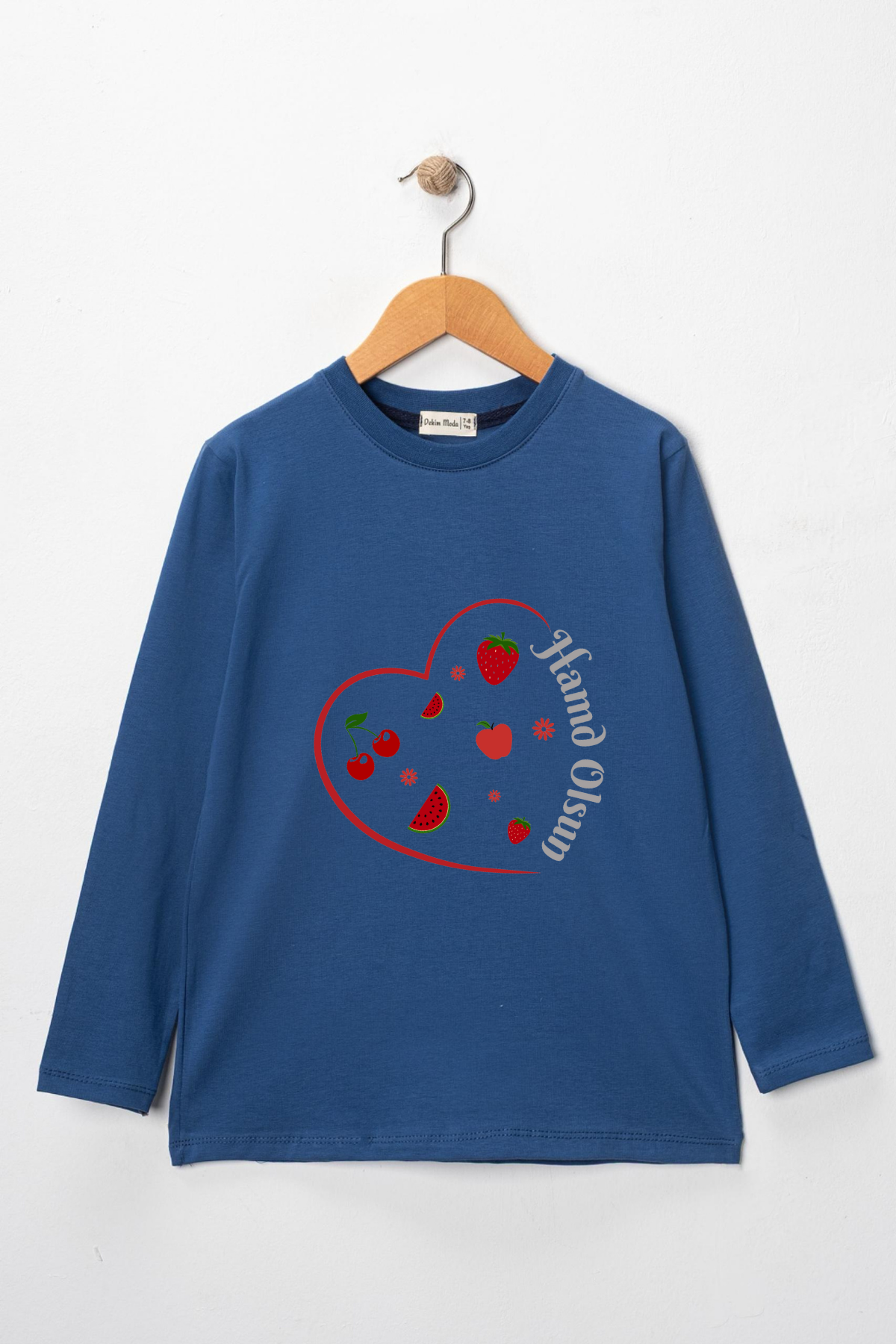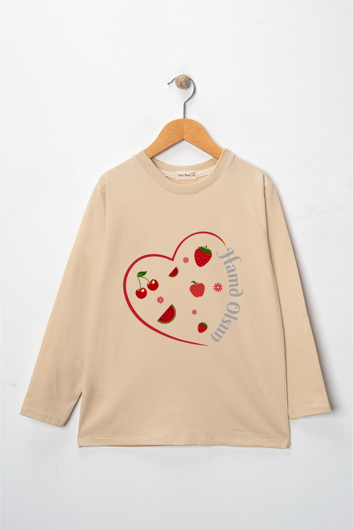 Kız Çocuk uzun kollu, pamuklu, bisiklet yaka, baskılı t-shirt. İslami tema ''Hamd Olsun '' baskılı özel tasarım üründür. Çocuk fıtratına uygun, çocukların sevebileceği görseller kullanılarak tasarlanmıştır. Bu tişört tüm etkinliklerde çocuğuza çok güzel eşlik edecektir. Kız çocuklarının gümüş parlayan dokulu yazısı ve meyve detayıyla ilgisini çeken, şık ve rahat bir ürünümüzdür. Regular (rahat/bol) kalıptır. Beden ölçülerine dikkat ederek yaşına uygun seçim yapabilirsiniz. %95 Pamuk %5 Elastan. Çok Yumuşak, esnek ve kaliteli bir üründür. Uygun sıcaklıkta yıkama yapılması halinde kumaşta çekme yaşanmayacaktır. Kumaşlarımız Oeko-Tex sertifikasına sahiptir. Ekoteks Belgesi, kumaşın zararsız olduğunu ve herhangi zararlı bir kimyasal madde içermediğini beyan etmektedir. #Özel Ürün 30 Derecede makinede yıkanabilir • Beyazlatıcı kullanımı önerilmez • Kurutucu kullanımı önerilmez • Tersten ve düşük ısı ile ütü önerilir