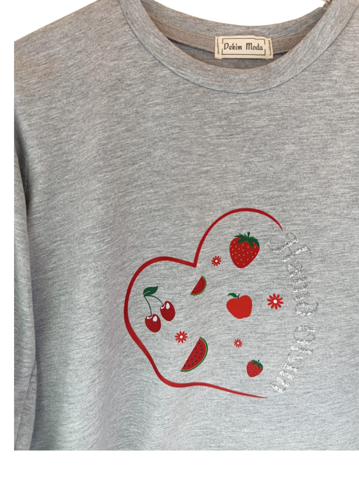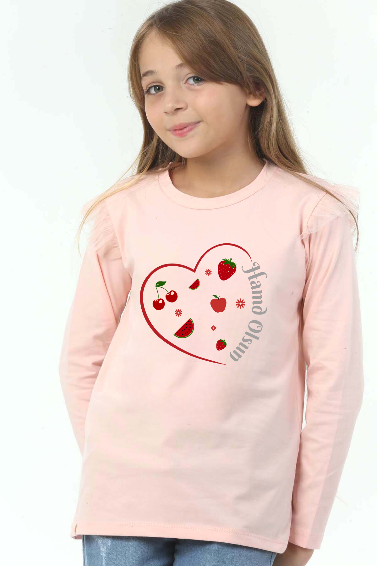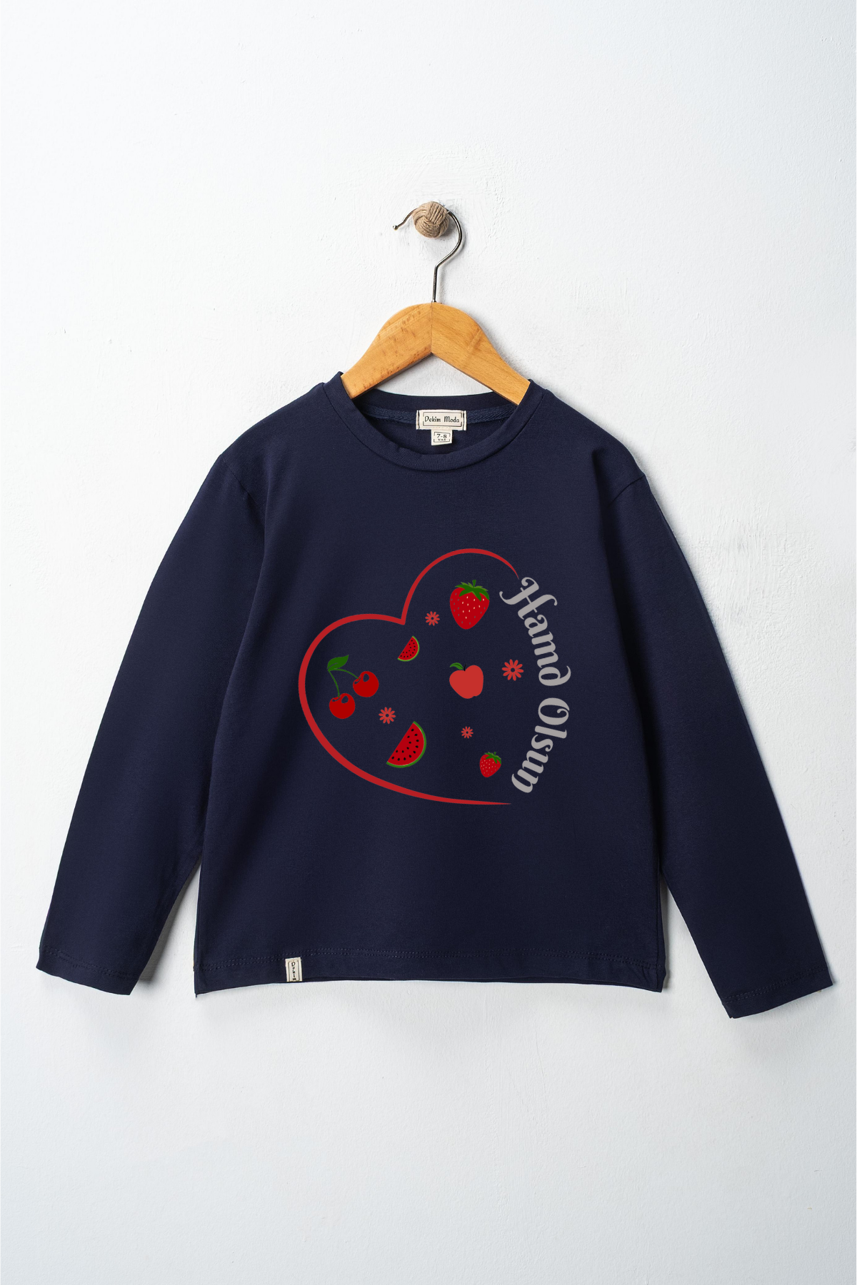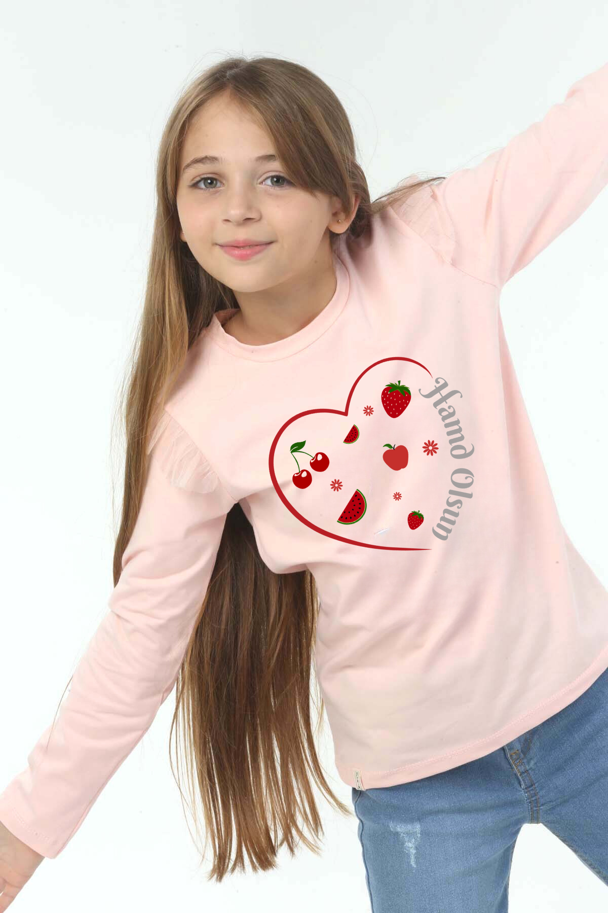 Kız Çocuk uzun kollu, pamuklu, bisiklet yaka, baskılı t-shirt. İslami tema ''Hamd Olsun '' baskılı özel tasarım üründür. Çocuk fıtratına uygun, çocukların sevebileceği görseller kullanılarak tasarlanmıştır. Bu tişört tüm etkinliklerde çocuğuza çok güzel eşlik edecektir. Kız çocuklarının gümüş parlayan dokulu yazısı ve meyve detayıyla ilgisini çeken, şık ve rahat bir ürünümüzdür. Regular (rahat/bol) kalıptır. Beden ölçülerine dikkat ederek yaşına uygun seçim yapabilirsiniz. %95 Pamuk %5 Elastan. Çok Yumuşak, esnek ve kaliteli bir üründür. Uygun sıcaklıkta yıkama yapılması halinde kumaşta çekme yaşanmayacaktır. Kumaşlarımız Oeko-Tex sertifikasına sahiptir. Ekoteks Belgesi, kumaşın zararsız olduğunu ve herhangi zararlı bir kimyasal madde içermediğini beyan etmektedir. #Özel Ürün 30 Derecede makinede yıkanabilir • Beyazlatıcı kullanımı önerilmez • Kurutucu kullanımı önerilmez • Tersten ve düşük ısı ile ütü önerilir