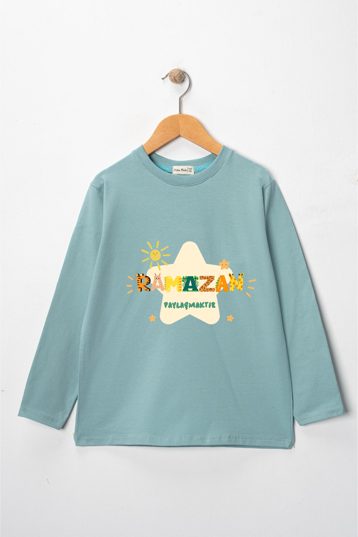 Kız Çocuk Uzun kollu, pamuklu, bisiklet yaka, baskılı t-shirt. İslami tema "Ramazan Paylaşmaktır"  baskılı özel tasarım üründür. Çocuk fıtratına uygun, çocukların sevebileceği görseller kullanılarak tasarlanmıştır. Değerli Ebeveyn, Birlikte yeni bir nesil için çabalayarak başarabiliriz, herkes bir ucundan tutarak kendi çocuklarını hayırlı evlat yetiştirme gayretinde olursa neslimiz için üzerimize düşeni yapmış olacağız.  Bu tişört tüm etkinliklerde çocuğuza çok güzel eşlik edecektir. Regular (rahat/bol)  kalıptır. Beden ölçülerine dikkat ederek yaşına uygun seçim yapabilirsiniz.  Mankenin ölçüleri boy 137cm  29kg  yaş 9 , Mankenin giydiği beden: 9-10 yaş %95 Pamuk %5 Elastan. Çok Yumuşak, esnek ve kaliteli bir üründür. Ekoteks Belgesi, kumaşın zararsız olduğunu ve herhangi zararlı bir kimyasal madde içermediğini beyan etmektedir. #Özel Ürün 30 Derecede makinede yıkanabilir • Beyazlatıcı kullanımı önerilmez • Kurutucu kullanımı önerilmez • Tersten ve düşük ısı ile ütü önerilir