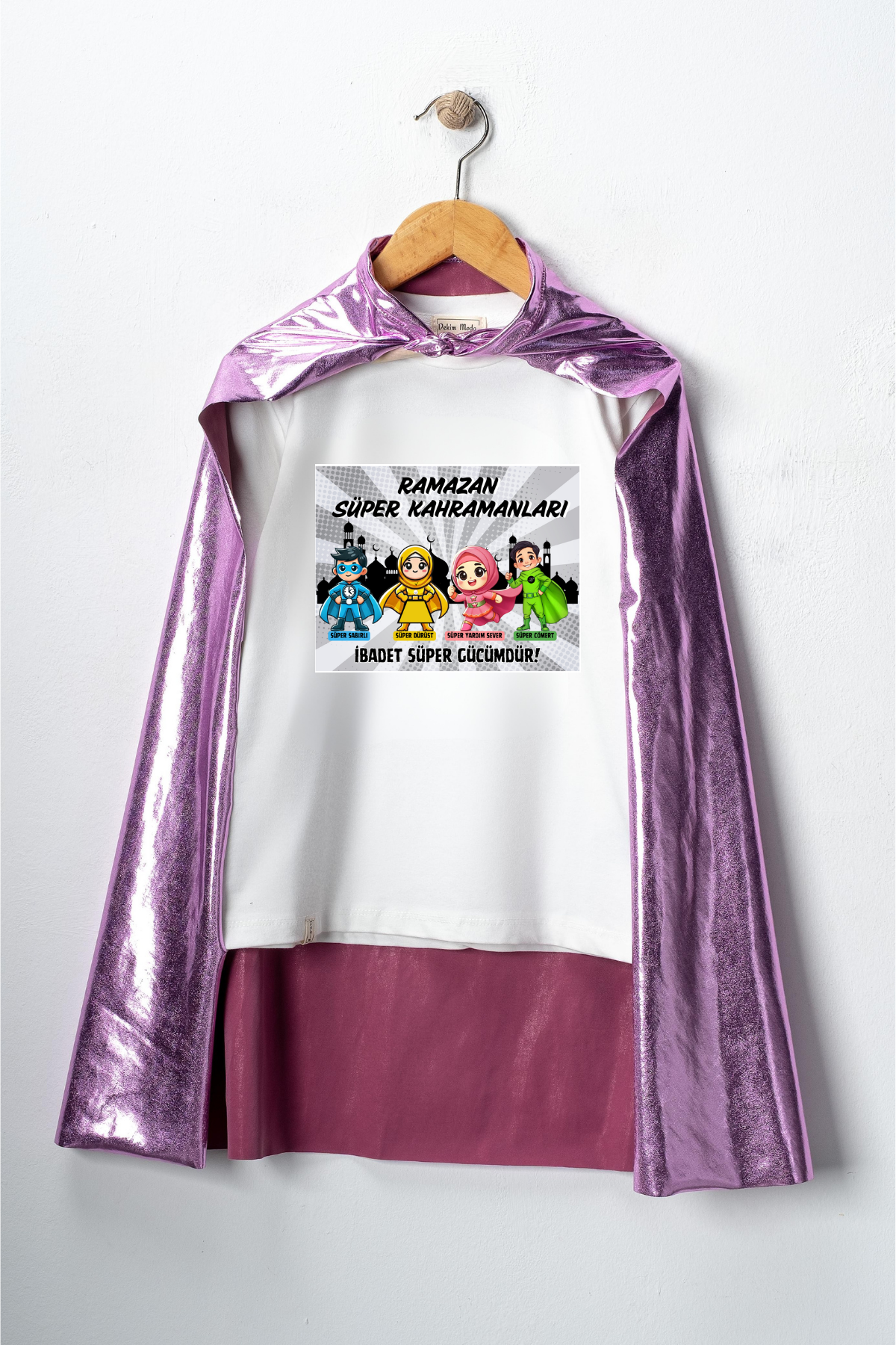 Kız Çocuk Uzun kollu tişört, pamuklu, bisiklet yaka, baskılı t-shirt. İslami tema Pelerinli "Ramazan Süper Kahramanları" baskılı özel tasarım üründür. Çocuk fıtratına uygun, çocukların sevebileceği görseller kullanılarak tasarlanmıştır. Bu tişört tüm etkinliklerde çocuğuza çok güzel eşlik edecektir. Erkek çocuklarının ilgisini çeken, şık ve rahat bir ürünümüzdür. Regular (rahat/bol) kalıptır. Beden ölçülerine dikkat ederek yaşına uygun seçim yapabilirsiniz. %95 Pamuk %5 Elastan. Çok Yumuşak, esnek ve kaliteli bir üründür. Uygun sıcaklıkta yıkama yapılması halinde kumaşta çekme yaşanmayacaktır. Kumaşlarımız Oeko-Tex sertifikasına sahiptir. Ekoteks Belgesi, kumaşın zararsız olduğunu ve herhangi zararlı bir kimyasal madde içermediğini beyan etmektedir. #Özel Ürün 30 Derecede makinede yıkanabilir • Beyazlatıcı kullanımı önerilmez • Kurutucu kullanımı önerilmez • Tersten ve düşük ısı ile ütü önerilir