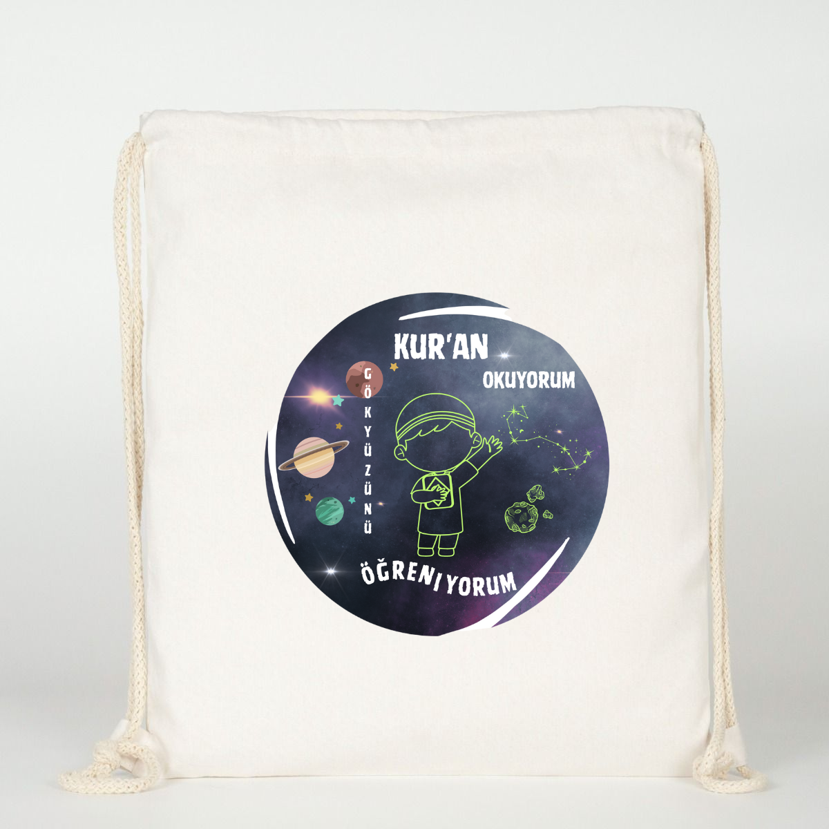 "Kuran Okuyorum Gökyüzünü Öğreniyorum" Baskılı Ham Bez Sırt Çantası %100 Pamuk