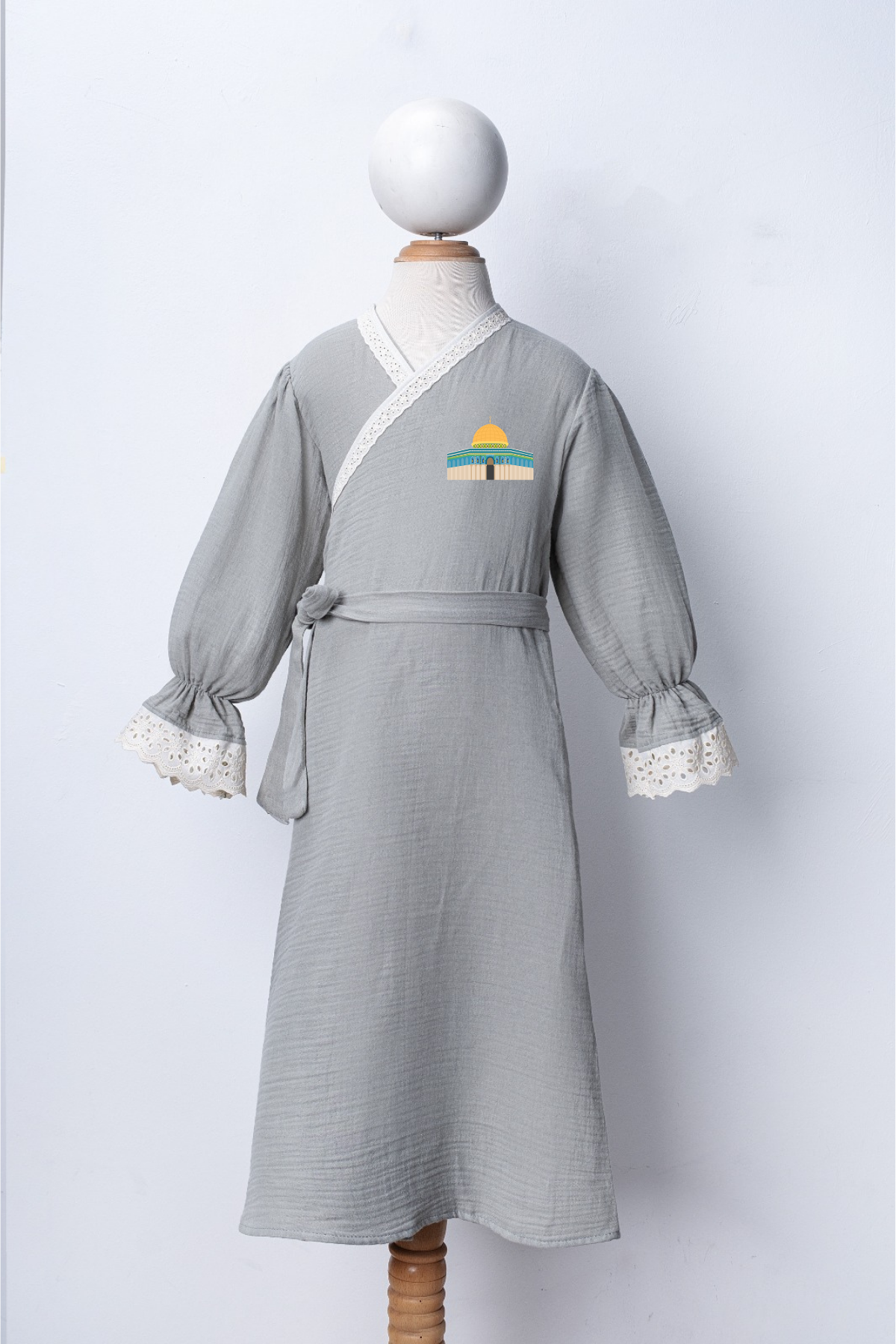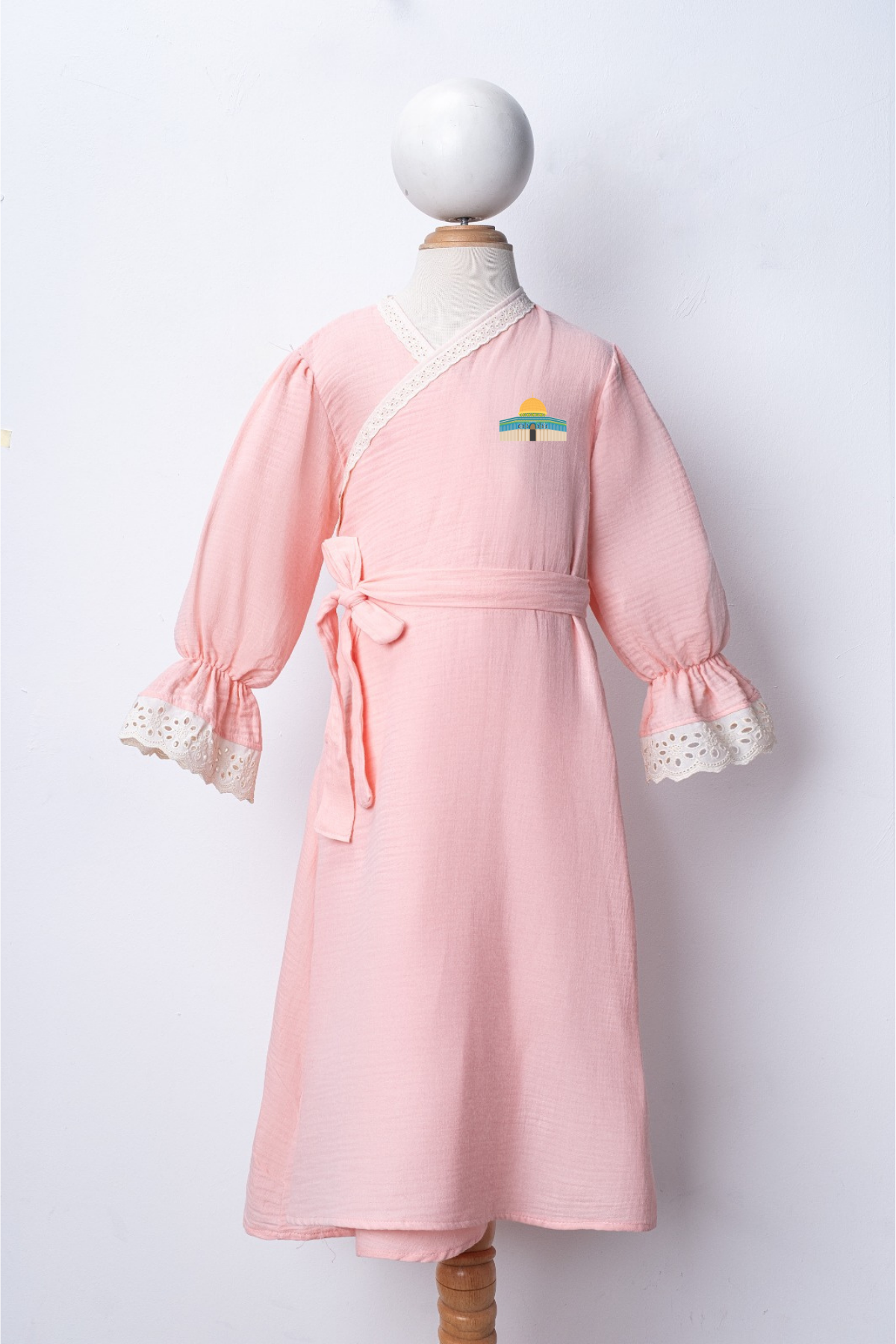 "Anne, ben kendim bağlayabilirim!" dedirten tasarımımızla tanışın. Özel bel kemeri ve pratik ip bağlama detayı sayesinde, minikler kimsenin yardımına ihtiyaç duymadan elbiselerini kendileri kolayca bağlayabilir. Müslin kumaşın hafifliği, fisto detaylarının zerafeti, hareket özgürlüğünü kısıtlamayan rahat kalıbı vardır, sıcak havalarda terletmez, çocukların ibadet sırasında konforlu hareket etmesine olanak sağlar.