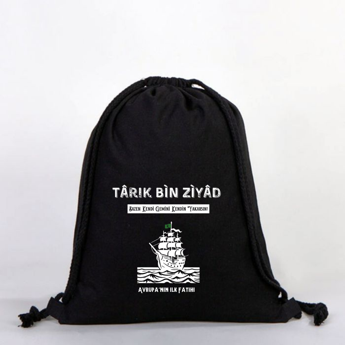 "Tarık Bin Ziyad" Baskılı Siyah Ham Bez Sırt Çantası %100 Pamuk
